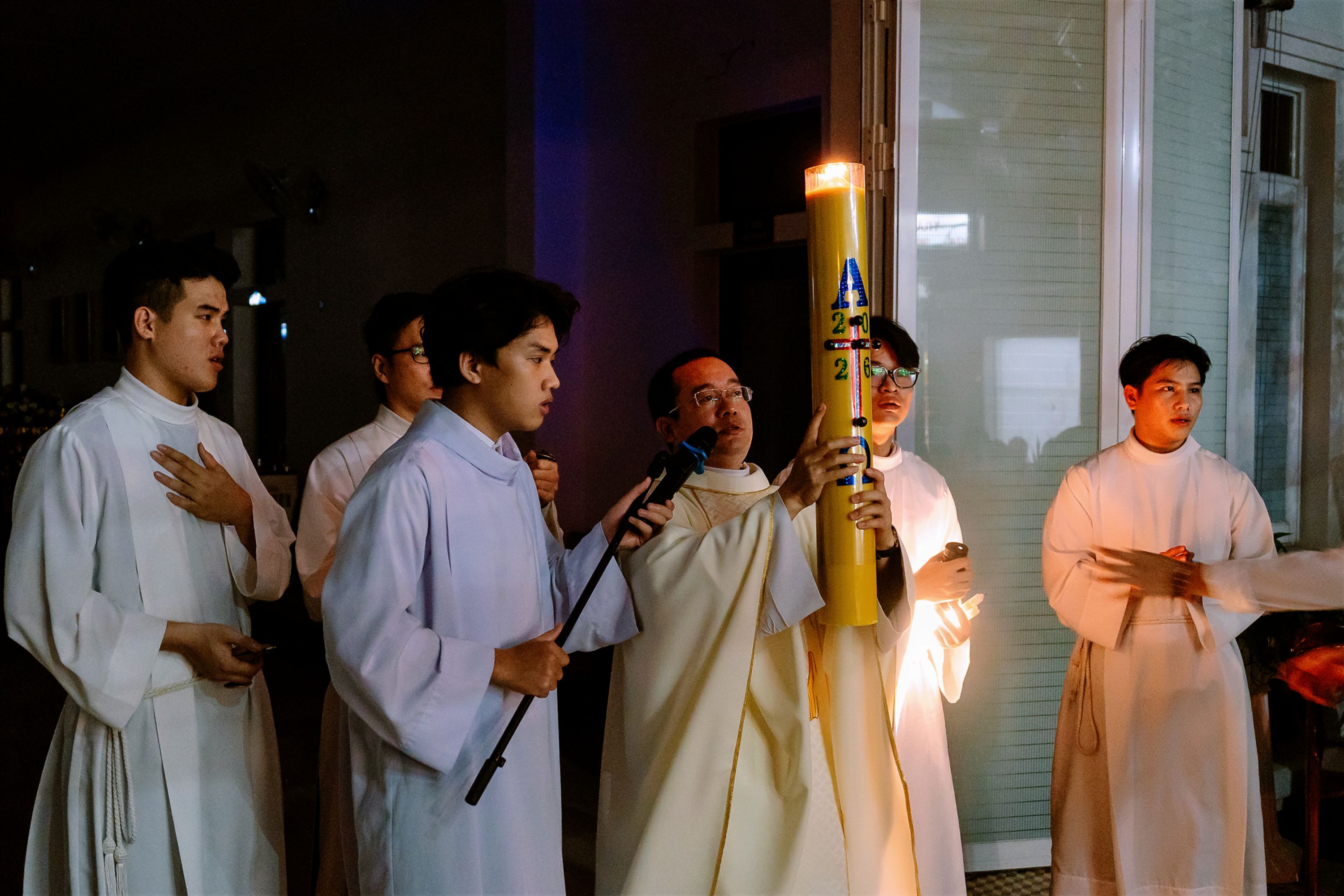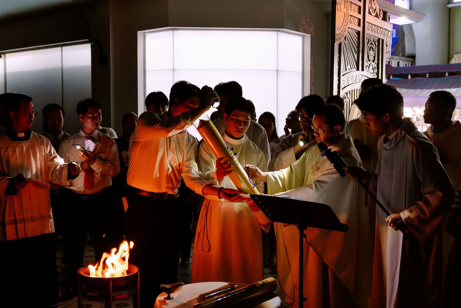 Cao điểm của đêm canh thức bắt đầu lúc 20g00 với nghi thức làm phép lửa. Trong không gian tĩnh lặng của màn đêm, ngọn lửa mới được thắp sáng như dấu chỉ của Đức Kitô – Ánh sáng thế gian. Từ ngọn lửa ấy, cây Nến Phục Sinh được thắp lên và rước vào nhà thờ, ánh sáng dần lan tỏa khi cộng đoàn cùng truyền lửa cho nhau. Từng ánh nến nhỏ hòa vào nhau tạo nên một biển sáng lung linh, diễn tả hành trình từ bóng tối của sự chết đến ánh sáng của sự sống mới. Lời công bố “Ánh sáng Chúa Kitô” vang lên ba lần như lời khẳng định: ánh sáng Phục sinh đang chiếu rọi vào thế giới và vào chính tâm hồn mỗi người.