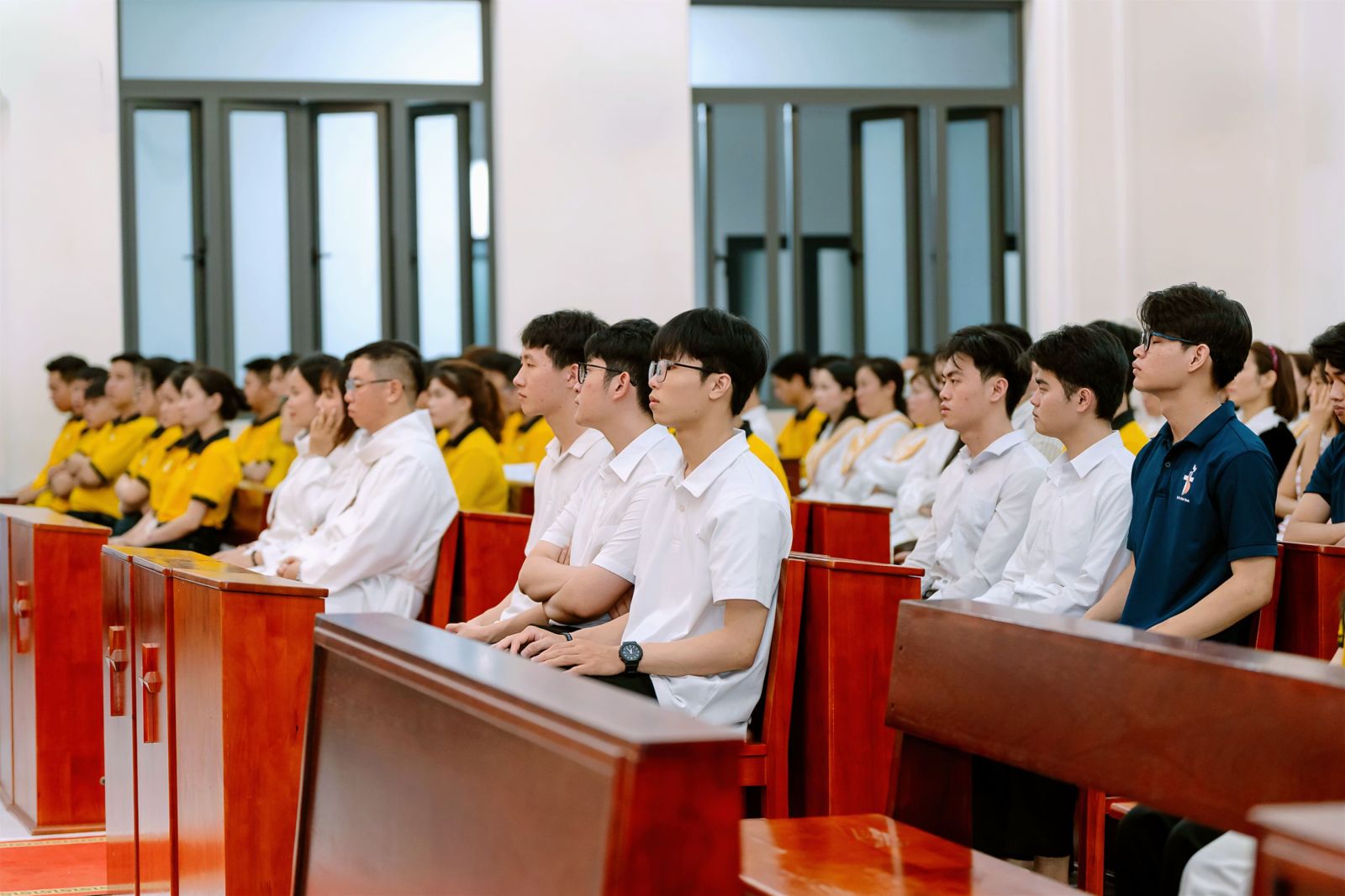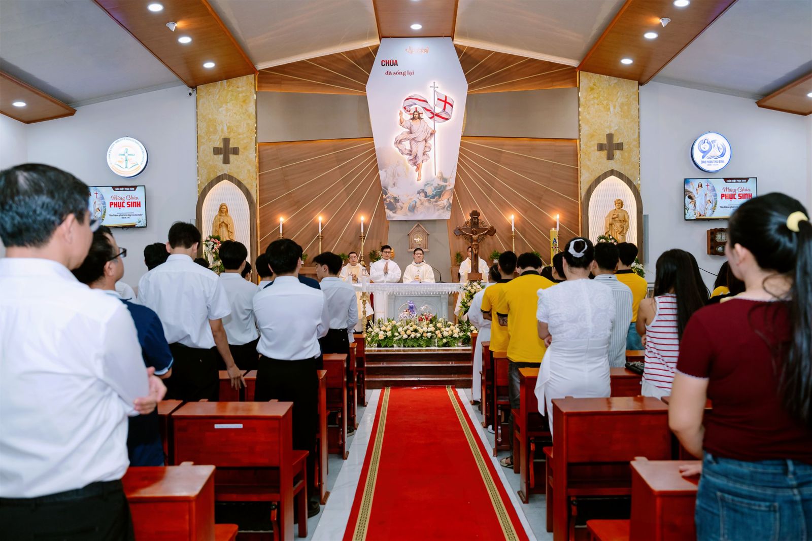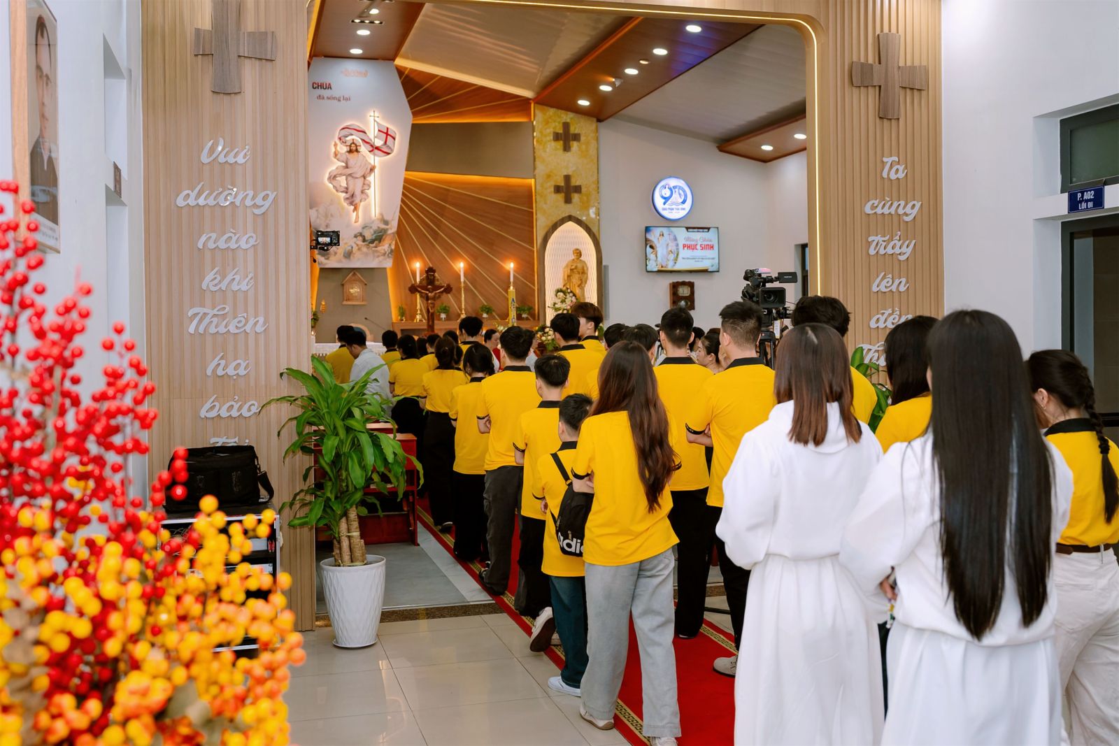Đúng 17g30, cộng đoàn dân Chúa đã quy tụ tại khuôn viên Trụ sở trong bầu khí phấn khởi và vui tươi. Mọi người khoác trên mình những bộ áo trắng tinh khôi – biểu tượng cho vinh quang của Thiên Chúa phá tan bóng tối tội lỗi, đem lại ánh sáng sự sống mới. Trước khi bước vào Thánh lễ, cộng đoàn đã long trọng rước kiệu Chúa Phục Sinh. Đoàn rước diễn ra trong bầu khí sốt sắng và trang nghiêm. Tiếng hát hào hùng của Ca đoàn Cecilia Đồng hương Giáo phận Thái Bình – Miền Nam cùng các bạn Sinh viên Công giáo Thái Bình – Miền Nam đã dệt nên một bầu khí linh thiêng, tràn đầy sức sống.
