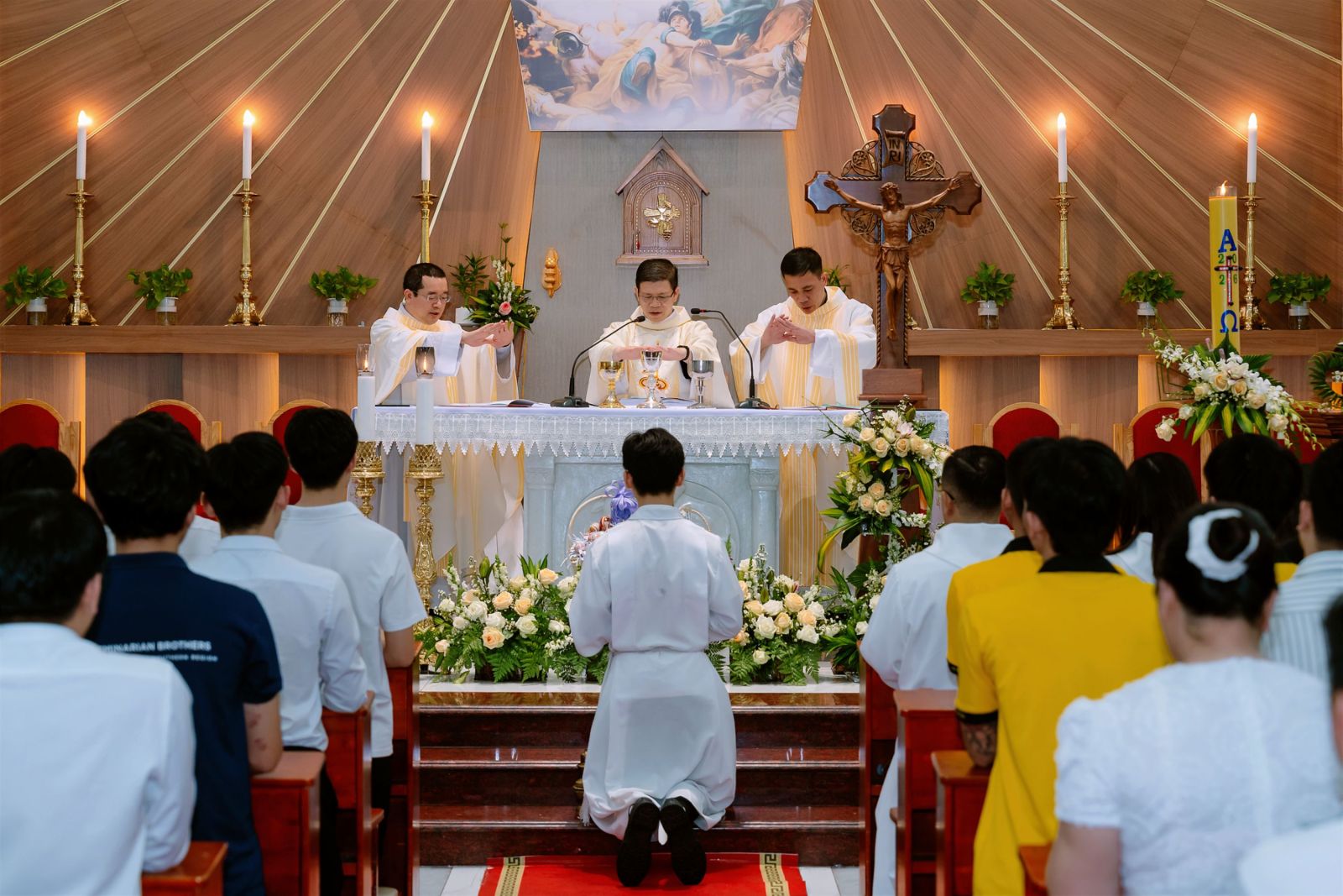 Thánh lễ đồng tế được cử hành vào lúc 18g00, do cha Phêrô Vêrôna Phạm Văn Nhật – Giám đốc Trụ sở chủ tế, cùng sự hiệp thông của quý cha, thầy phó tế và cộng đoàn. Mở đầu Thánh lễ, cha Phêrô Vêrôna đã có lời chúc mừng Lễ Phục Sinh nồng nhiệt đến toàn thể cộng đoàn dân Chúa, đồng thời mời gọi mọi người dành cho nhau những tràng pháo tay để cùng chia sẻ niềm vui Chúa khải hoàn sống lại.