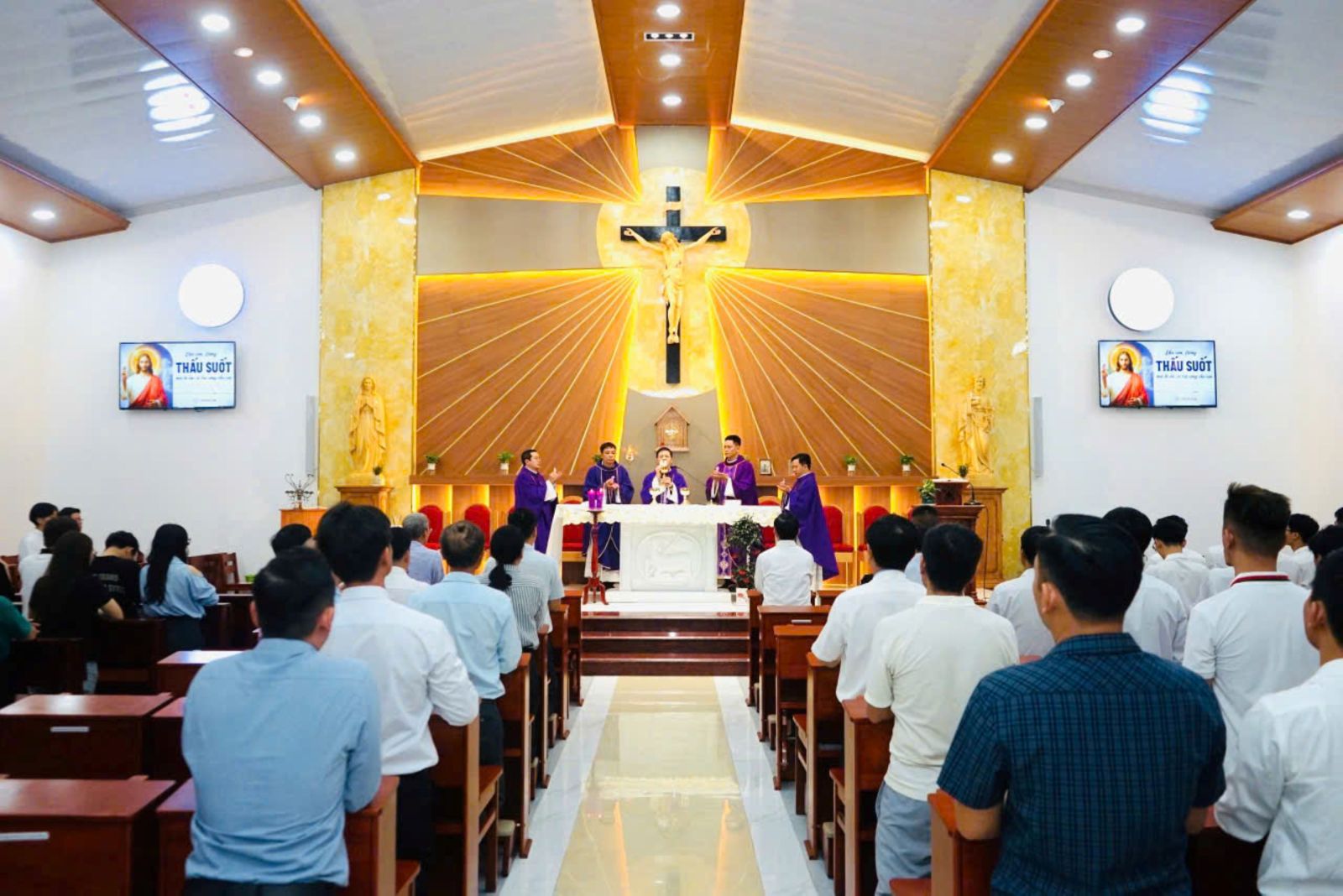 Sau phần nguyện ngắm, đúng 20g00, cộng đoàn cùng quý cha đang học tập tại miền Nam đã hiệp dâng Thánh lễ - thứ Tư Lễ Tro. Trong bài giảng, Cha Phao-lô Nguyễn Văn Liêm nhấn mạnh tầm quan trọng của việc nhìn vào bên trong chính mình, thay vì chạy theo những giá trị hào nhoáng bề ngoài. Ngài cảnh tỉnh về lối sống hình thức mang tính “phông bạt”, hay “flex” xu thời ngày nay. Thay vì đối mặt với sự thật, họ dùng vẻ hào nhoáng để dựng lên một hình ảnh khác xa thực tế. Ngài mời gọi mỗi tín hữu hãy tận dụng thời gian Mùa Chay để quay về với lòng mình, nhận ra thân phận thụ tạo tro bụi của chính mình để canh tân đời sống nhằm làm mới lại chính con người của mình trong tương qua với Chúa, với tha nhân và chính mình ngang qua các việc đạo đức truyền thống: ăn chay, chia sẻ và cầu nguyện.