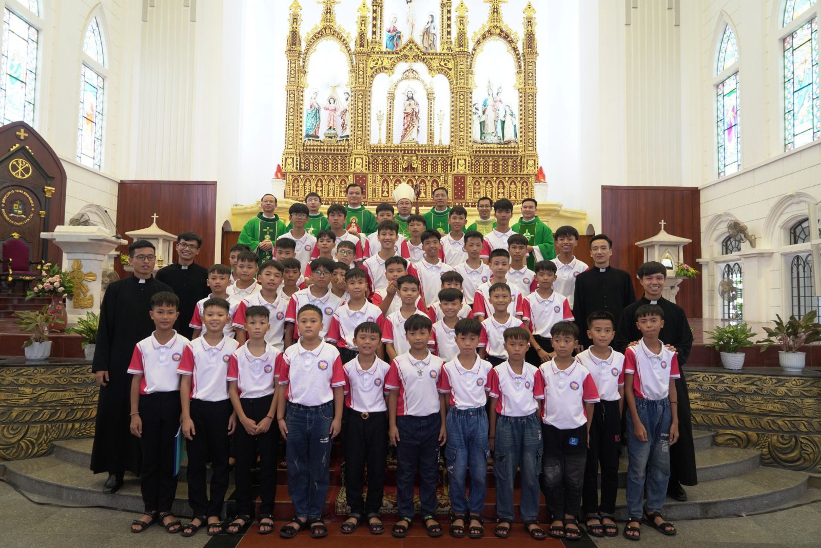 Sau Thánh Lễ, Đức Cha, quý cha, quý thầy, quý phụ huynh cùng toàn thể các em đã chụp hình lưu niệm với Đức Cha và cùng nhau chung tham dự bữa cơm thân mật.
