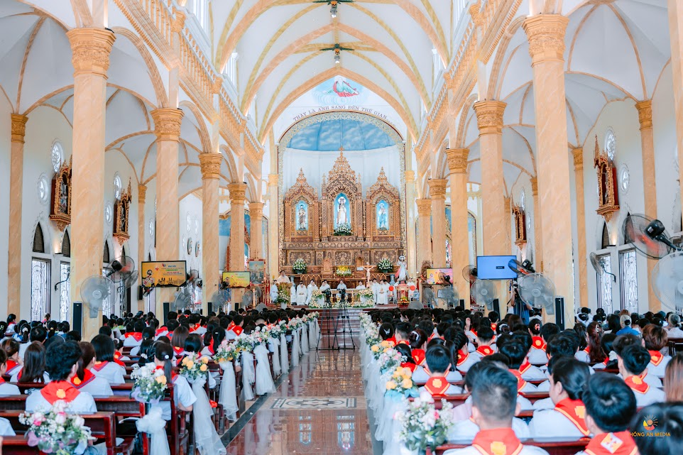 Đến với Đại hội, các đoàn sinh còn được đắm chìm trong bầu khí linh thiêng trong giờ Chầu Chúa Giê su Thánh Thể. Và ngay sau cuộc rước, các đoàn sinh bước vào thánh lễ để được cùng nhau kín múc nguồn sống đích thực nuôi dưỡng tâm hồn các em là bí tích Thánh Thể.