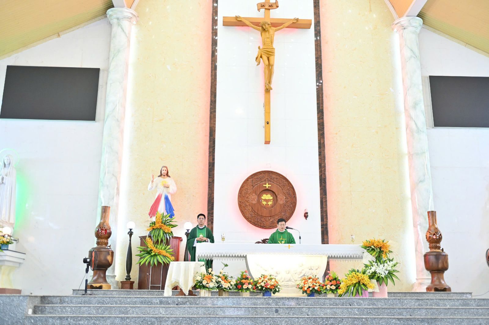 Vào lúc 9g30, cha Đặc trách Di dân Phê-rô Vê-rô-na Phạm Văn Nhật đã chủ sự cuộc rước kiệu cung nghinh Thánh Quan thầy từ khuôn viên nhà mục vụ Hà Phát ra thánh đường. Thánh lễ được cử hành long trọng với chủ tế của cha Đặc trách Phê-rô Vê-rô-na. Đồng tế với ngài là cha xứ Đông Châu Giu-se Nguyễn Văn Vương.