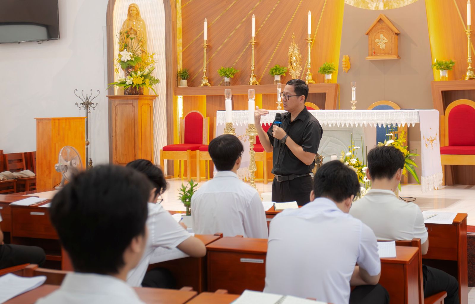 Tiếp nối là phần chia sẻ tĩnh tâm của cha Gio-an Phạm Duy Anh, SJ. – Đặc trách Nhà Ứng sinh Dòng Tên Việt Nam, với chủ đề: “Đừng sợ nên Thánh.” Bằng giọng nói trầm ấm và cách dẫn dắt gần gũi, cha Gio-an mở ra cho anh em một cái nhìn mới mẻ và thực tế về ơn gọi nên Thánh – ơn gọi không chỉ dành cho một số ít người đặc tuyển, mà là lời mời gọi phổ quát của mọi tín hữu trong mọi bậc sống. Cha nhấn mạnh rằng, “đừng sợ không đủ điều kiện để nên Thánh”, bởi các Thánh cũng là những con người mang đầy giới hạn, yếu đuối, nhưng chính trong hành trình vượt qua bất toàn đó, họ đã dần nên giống Chúa hơn từng ngày. Cha cũng giúp anh em nhận ra cách phân định bậc sống của mình qua việc lắng nghe tiếng nói sâu thẳm trong lòng, nhận ra ý Chúa qua đời sống cầu nguyện, và đối chiếu với những điều kiện thực tế của ơn gọi mà mình đang tìm hiểu. Bên cạnh đó, cha còn chia sẻ những trở ngại thường gặp trên con đường nên Thánh, những nhân đức cần thiết để một người có thể lớn lên trong tình yêu và trung thành với tiếng gọi của Thiên Chúa.