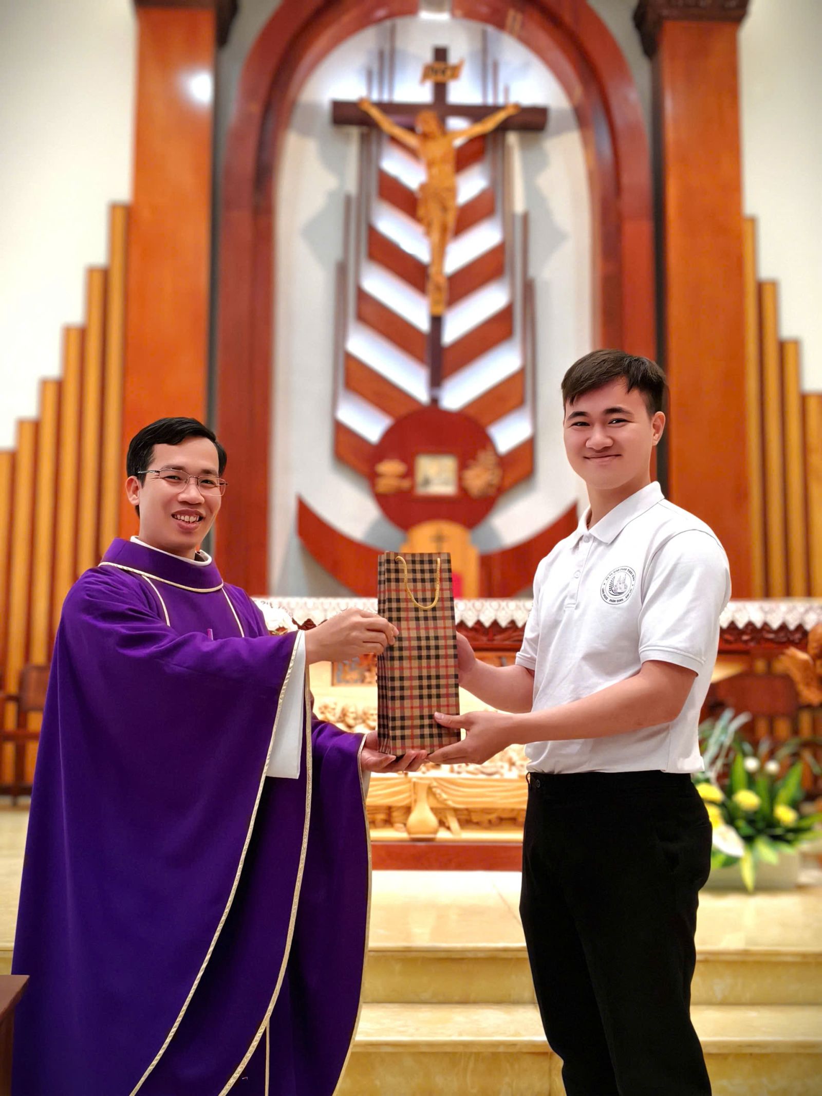 Cuối Thánh lễ, anh em dự tu có những tâm tình và món quà đơn sơ chúc mừng cha Đặc trách nhân kỷ niệm 5 năm ngày thụ phong linh mục của ngài. Sau đó, anh em cùng xum vầy bên quý cha và quý thầy trong bữa cơm tại nhà ăn của Tòa Giám mục.