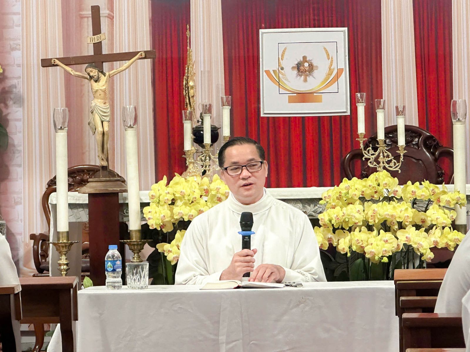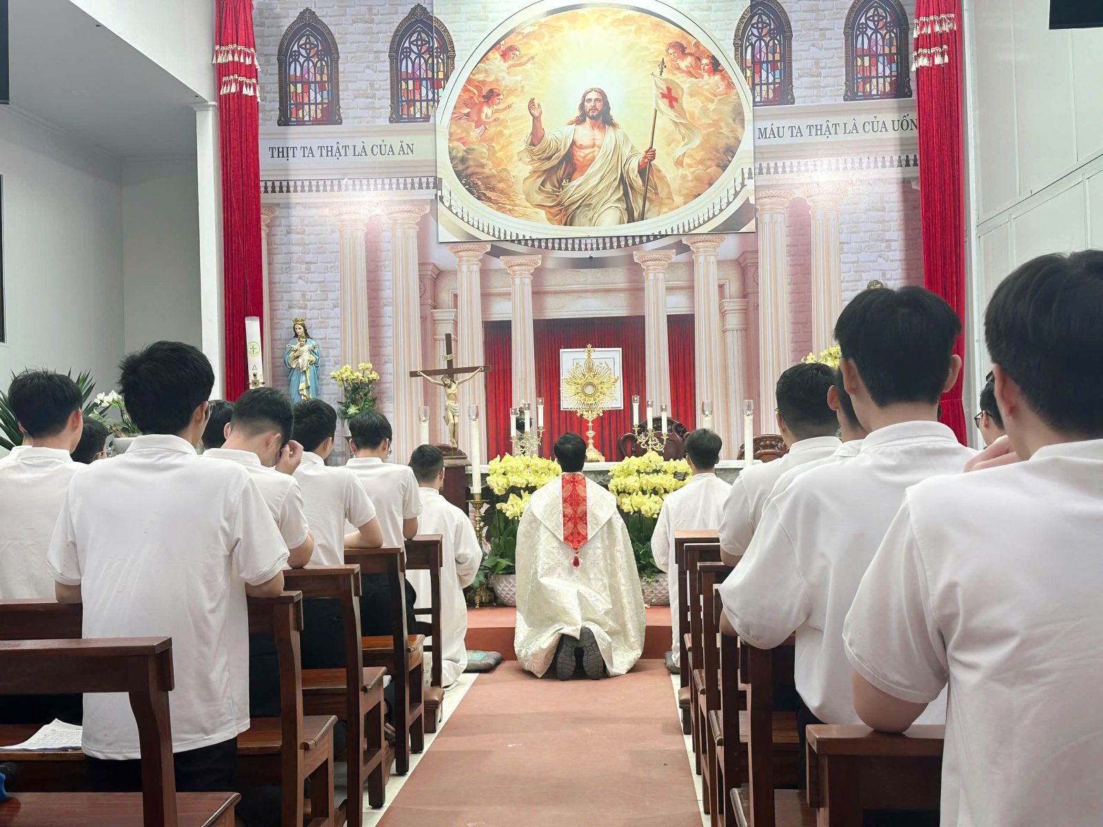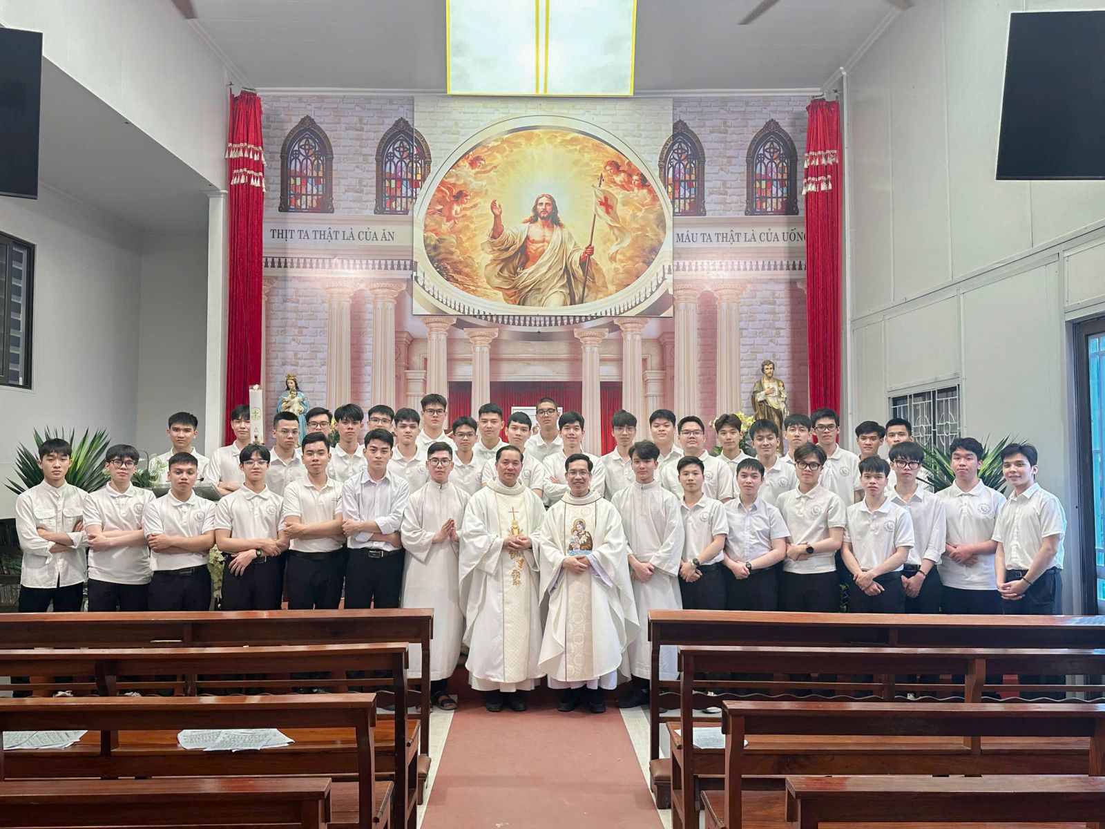 Cao điểm của buổi tĩnh tâm là Thánh lễ Chúa Nhật III Phục Sinh do cha Đặc trách Giuse chủ tế. Trong bài giảng, cha Phêrô tiếp tục mời gọi anh em nhìn lại và đào sâu hơn nữa đời sống đức tin của mình. Cha nhấn mạnh rằng đức tin của mỗi người Công Giáo được đặt trên nền tảng các Thánh Tông Đồ, đó là một đức tin rõ ràng, không thể chối cãi như thánh Phêrô đã quả quyết trong bài đọc 1 trích sách Công vụ Tông Đồ (Cv 2,14.22b-33). Dựa trên trình thuật hai môn đệ trên đường Emmau, cha gợi lại hình ảnh hai môn đệ ngay lập tức đứng dậy, trở về Giêrusalem loan báo tin mừng Phục Sinh - niềm tin của chính các ông nhận được sau khi được Chúa Giêsu “mở mắt” qua cử chỉ bẻ bánh. Chính Chúa Kitô Phục Sinh đã thắp sáng niềm tin, đốt nóng lên niềm hăng say để hai môn đệ tiếp tục nhiệt thành trên con đường lý tưởng ban đầu mà họ đã quyết bước theo. Kết thúc bài chia sẻ, cha mời gọi anh em hãy xác quyết lại niềm tin, niềm hy vọng vào Chúa Kitô Phục Sinh và liên lỉ cầu nguyện, kết hiệp với Ngài để ngọn lửa đức tin và nhiệt huyết ơn gọi luôn cháy sáng.