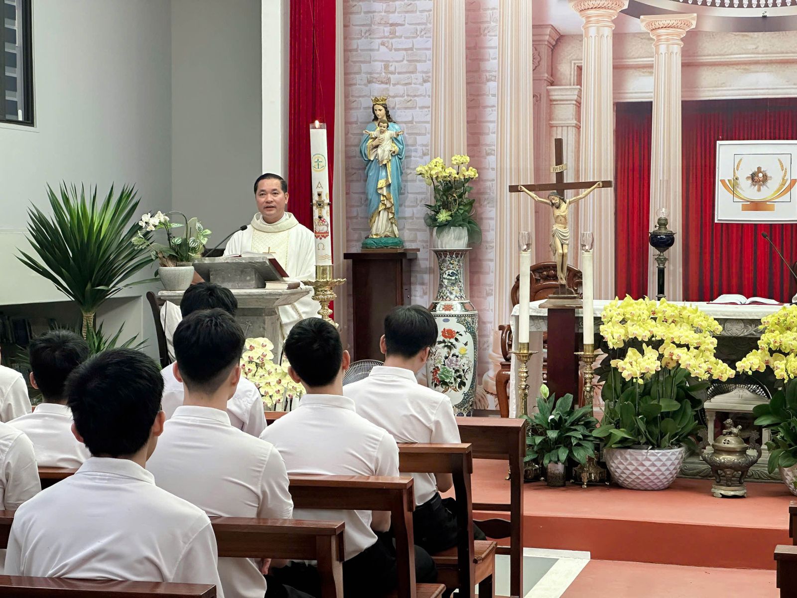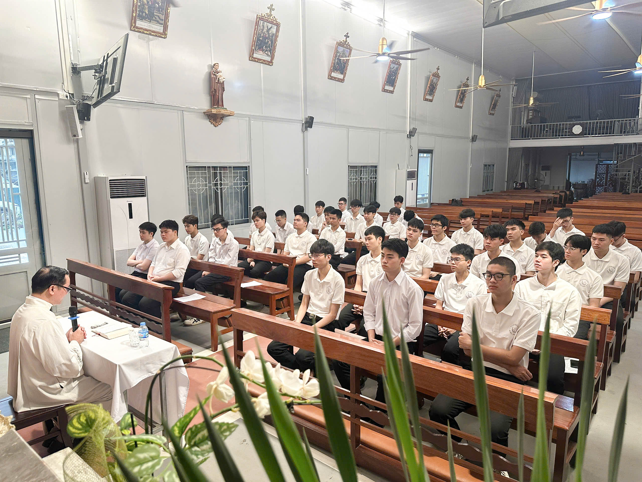Sau những phút gặp gỡ với cha Đặc trách, anh em bước vào giờ tĩnh tâm dưới sự hướng dẫn của cha Phêrô Vũ Hữu Thành. Khởi đi từ trích đoạn Lc 24,13-35, cha đã chia sẻ với anh em chủ đề “Để Lời Chúa dạy dỗ và hướng dẫn”. Cha đã gợi lại hình ảnh hai môn đệ trên đường Emmau: họ đã từng bước theo Đức Giêsu, đã từng đặt trọn hy vọng nơi Người nhưng cái chết của Đức Giêsu đã khiến họ rời bỏ cộng đoàn, rời bỏ nơi đã từng là trung tâm niềm tin của mình trong sự chán chường, thất vọng, để quay về một nơi xa hơn không chỉ về mặt địa lý, mà còn là khoảng cách trong tâm hồn. Cha nhấn mạnh rằng chính hoàn cảnh khi ấy đã khiến hai môn đệ rời xa Chúa, rời xa lý tưởng, nhiệt huyết ban đầu của bản thân và xa rời niềm hy vọng mà hai ông đã từng cậy trông. Từ đó, cha nhắc nhở anh em hãy cẩn trọng trong việc sử dụng công nghệ AI, mạng xã hội bởi vì đôi khi chính môi trường hiện đại, đầy đủ tiện nghi… lại ngăn cản chúng ta đến với Chúa và đánh mất nhiệt huyết ban đầu của mình. Bên cạnh đó, cha cũng mời gọi anh em hãy canh tân đời sống đức tin của bản thân qua việc yêu mến và lắng nghe Lời Chúa, tham dự Thánh lễ thường xuyên, năng lần hạt Mân Côi… để mỗi người được Lời Chúa và Thánh Thể Chúa nuôi dưỡng và nhờ Đức Mẹ dẫn đưa anh em đến gần Chúa hơn.