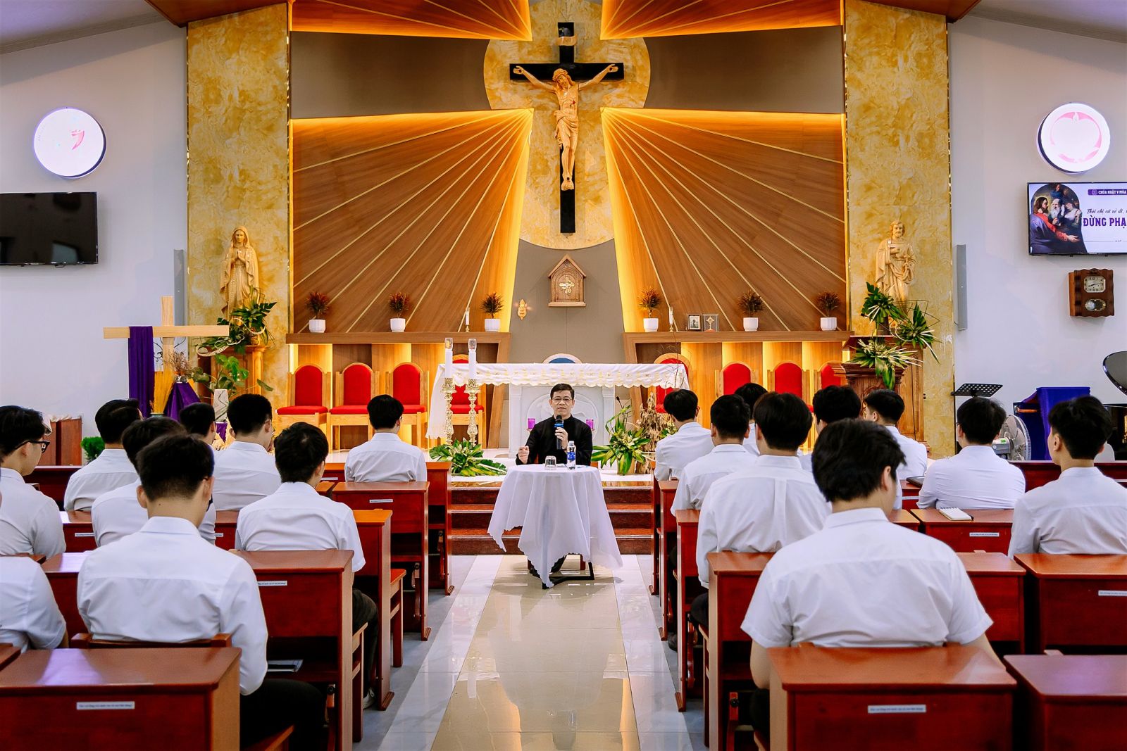 Vào lúc 08g30, anh em dự tu được lắng nghe Đức ông Giu-se Phạm Xuân Thắng chia sẻ đề tài: “Từ bỏ”. Ngài mời gọi anh em: muốn theo Chúa thì cũng phải “từ bỏ” – từ bỏ tất cả. Phải từ bỏ chính mình vì những thứ thuộc về bản thân sẽ khó lòng mà buông tay được. Ngoài ra để có được hạnh phúc, tự do thì anh em cần phải từ bỏ tội lỗi vì khi phạm tội chúng ta luôn sống trong sự đau khổ, trói buộc. Đặc biệt trong bối cảnh xã hội ngày một phát triển, Đức ông đã nhấn mạnh rằng: “Mỗi chúng ta tuy vô tư nhưng không được vô tâm, biết nhiều không bằng biết giữ chừng mực. Theo Chúa là đi trên con đường hẹp, tuy gian khổ nhưng nó sẽ an toàn và mang đến hạnh phúc.”