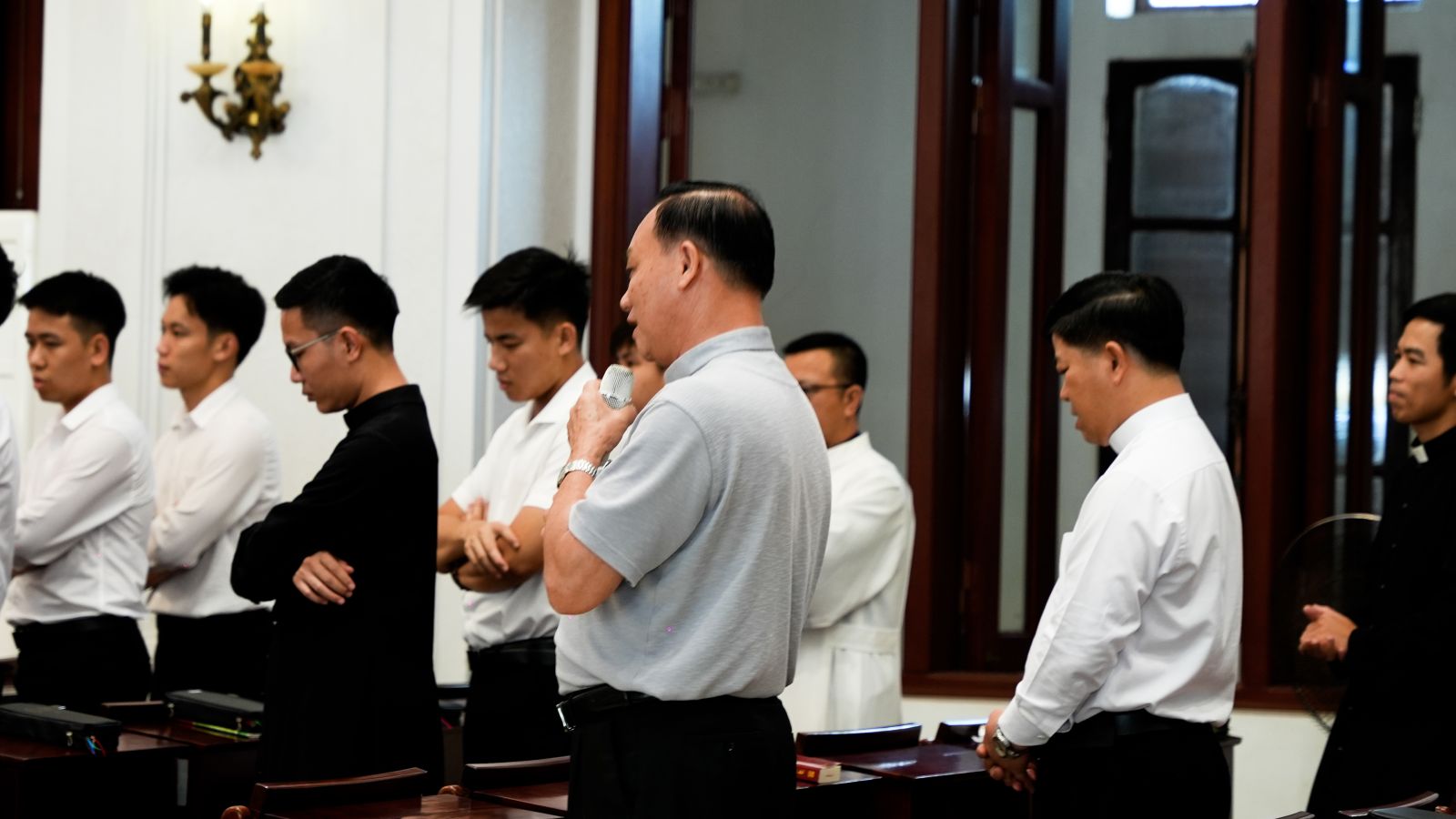 Trước khi ra phi trường, Đức Cha Đa Minh cùng quý cha, quý thầy và quý dì đang phục vụ tại Tòa Giám mục đã quy tụ tại Nhà nguyện, quỳ trước Thánh Thể Chúa để phó dâng chuyến đi của vị chủ chăn Giáo phận trong bàn tay yêu thương của Thiên Chúa.