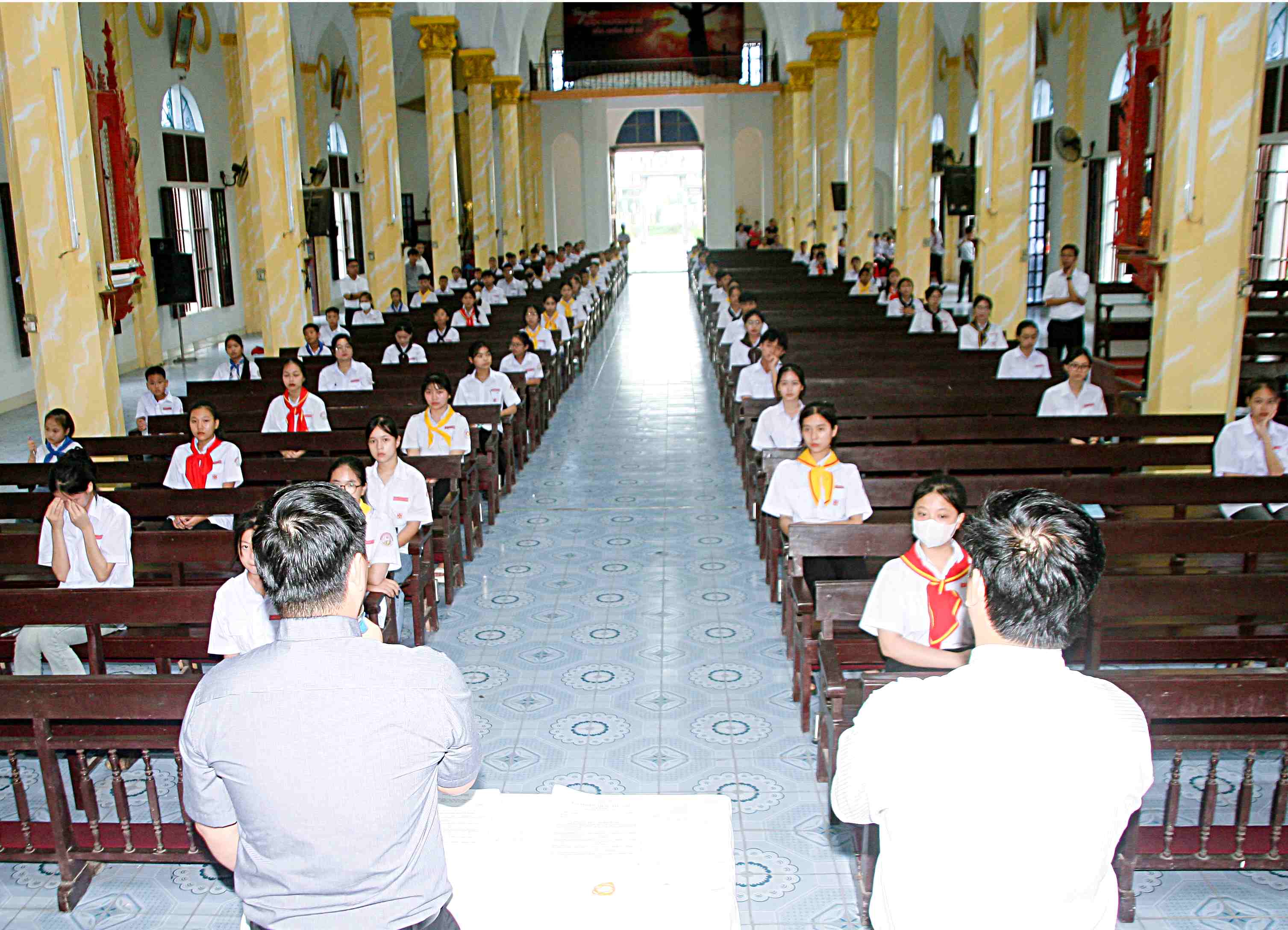 Vào lúc 8g30, sau giây phút thánh hoá đầu giờ, cha Giu-se Vũ Văn Chiều – Trưởng ban Giáo lý hạt Kiến Xương đã tuyên bố lý do và phát đề thi. Coi thi là quý cha, quý xơ, quý thầy chủng sinh đang giúp các xứ trong giáo hạt; phòng thi là nhà thờ và các phòng học giáo lý.