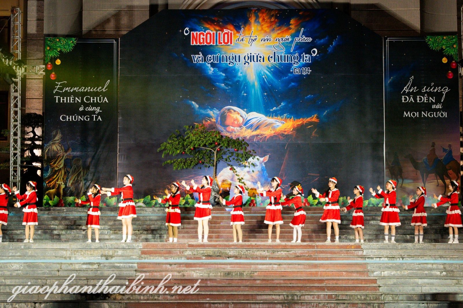 Chương trình hoan ca với chủ đề “Đức Ki-tô, ánh sáng cho trần gian” được nối tiếp nhau bởi những tiết mục đặc sắc của các em thiếu nhi Giáo xứ Chính Toà, các thỉnh sinh Dòng Nữ Đa Minh, các thầy Chủng sinh của Đại Chủng viện Thánh Tâm Thái Bình. Màn Diễn nguyện của hơn 200 diễn viên từ các em nhỏ 4-5 tuổi, đến các cụ già trên 70, nói lên một đức tin mạnh mẽ và lòng mến vô điều kiện của các tín hữu Công Giáo với Đấng Cứu Thế là Đức Giêsu Ki-tô. Đây không phải là trình diễn các tiết mục văn nghệ, nhưng là bản trường ca những khúc hát tạ ơn. Tất cả đều hoà nhịp trong một tâm tình thờ lạy, chúc tụng và ngợi khen Thiên Chúa – Đấng Tạo dựng và Cứu độ muôn loài.