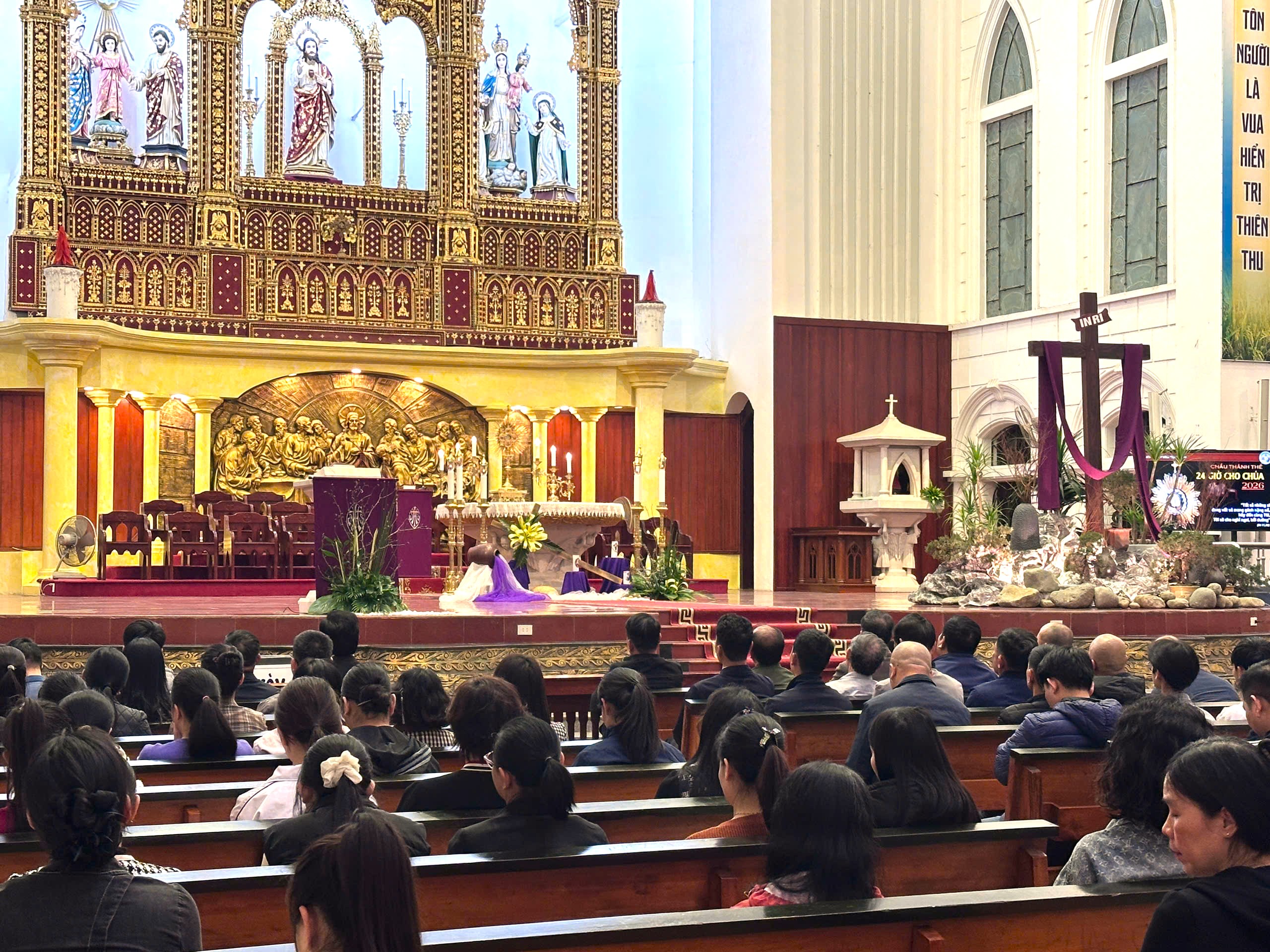 Chương trình “24 giờ cho Chúa” đã được thực hiện từ năm 2015 tại các giáo phận trên toàn thế giới. Đó là sáng kiến của Đức Thánh Cha Phanxicô khởi xướng, nhằm tạo cơ hội cho các tín hữu dừng lại để tôn thờ Chúa, hồi tâm, sám hối và xưng tội. Cùng với “Sứ điệp Mùa Chay 2026 của Đức Thánh Cha Lêô XIV là “Lắng nghe – Ăn chay – Cùng nhau”, cha Chánh xứ Giuse, cha Phó xứ Phêrô cùng quý thầy Phó tế đã sắp xếp chương trình Chầu Thánh Thể cho các hội đoàn trong Giáo xứ. Từ Huynh đoàn Đa Minh, Gia trưởng, Hiền Mẫu, Giới trẻ, Thiếu nhi Thánh Thể, tới Ban Ca đoàn, Ban Kim nhạc...mỗi hội đoàn ít nhất thực hiện 02 giờ Chầu Chúa. 19 giờ Chầu liên lỉ, bắt đầu từ 15g00 chiều thứ Sáu (ngày 13/3) đến 15g00 chiều thứ Bảy (14/3). Mỗi giờ Chầu được cử hành trong đúng 1 giờ đồng hồ. Tiến trình trong mỗi giờ Chầu được cha Chánh xứ Giuse hướng dẫn chi tiết và yêu cầu thực hiện nghiêm ngặt, để tạo một nề nếp chuẩn mực cho những cử hành Phụng vụ về sau. Cách thức thực hiện các giờ Chầu nhằm hướng tới sự thức tỉnh nội tâm, khơi dậy đức tin và thực hành một đời sống chiêm nghiệm. Bắt đầu giờ Chầu, cộng đoàn lắng nghe một bài Tin Mừng. Tiếp theo là các bài suy niệm được phát triển theo ý hướng nội dung bài Tin Mừng, phù hợp cho từng giới. Sau mỗi bài suy niệm là một vài lời gợi ý nhằm giúp các tín hữu xét mình cho trúng, cho đúng. Chẳng hạn: