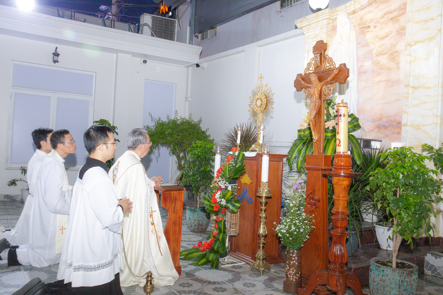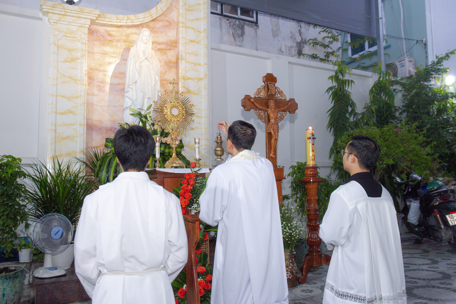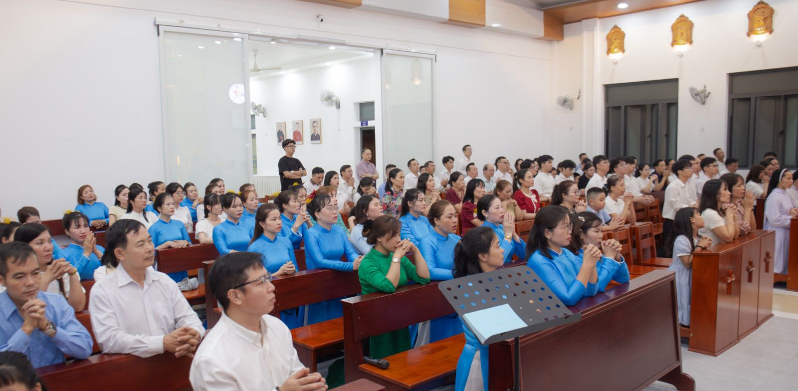 Khi mặt trời dần khuất bóng, vào lúc 17g15, cộng đoàn cùng sốt sắng bước vào Giờ Chầu Thánh Thể và lần chuỗi Mân Côi. Trong không gian linh thiêng, lời kinh mân côi để dâng kính Mẹ nhịp nhàng hòa cùng nhịp thở của lòng mến, tựa như những cánh hoa thiêng nối kết những tâm hồn lại với nhau. Đó không chỉ là lời cầu nguyện, mà còn là tiếng lòng của người con xa quê, vẫn mang trong tim lời kinh thân thương, đã từng vang lên nơi mái nhà xưa, nơi ngôi nhà thờ quê mẹ Thái Bình.