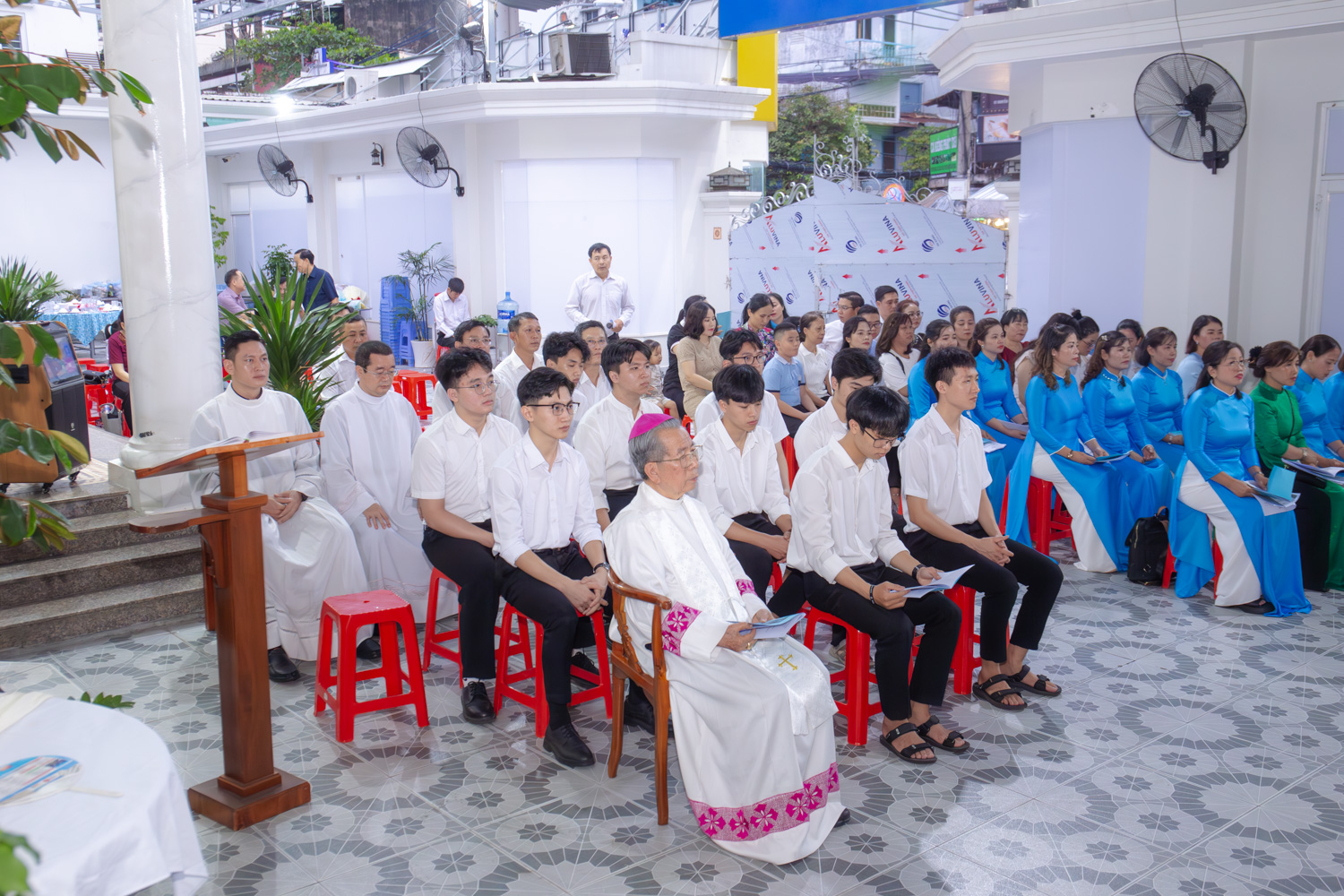Vào lúc 18g30, sau cuộc rước, Thánh lễ mừng kính Đức Mẹ Mân Côi được long trọng cử hành. Đức cha Phê-rô Nguyễn Văn Đệ, nguyên Giám mục Giáo phận Thái Bình, chủ tế Thánh lễ; cùng đồng tế có quý cha đang tu học và phục vụ tại Trụ sở Giáo phận Thái Bình – Miền Nam.
