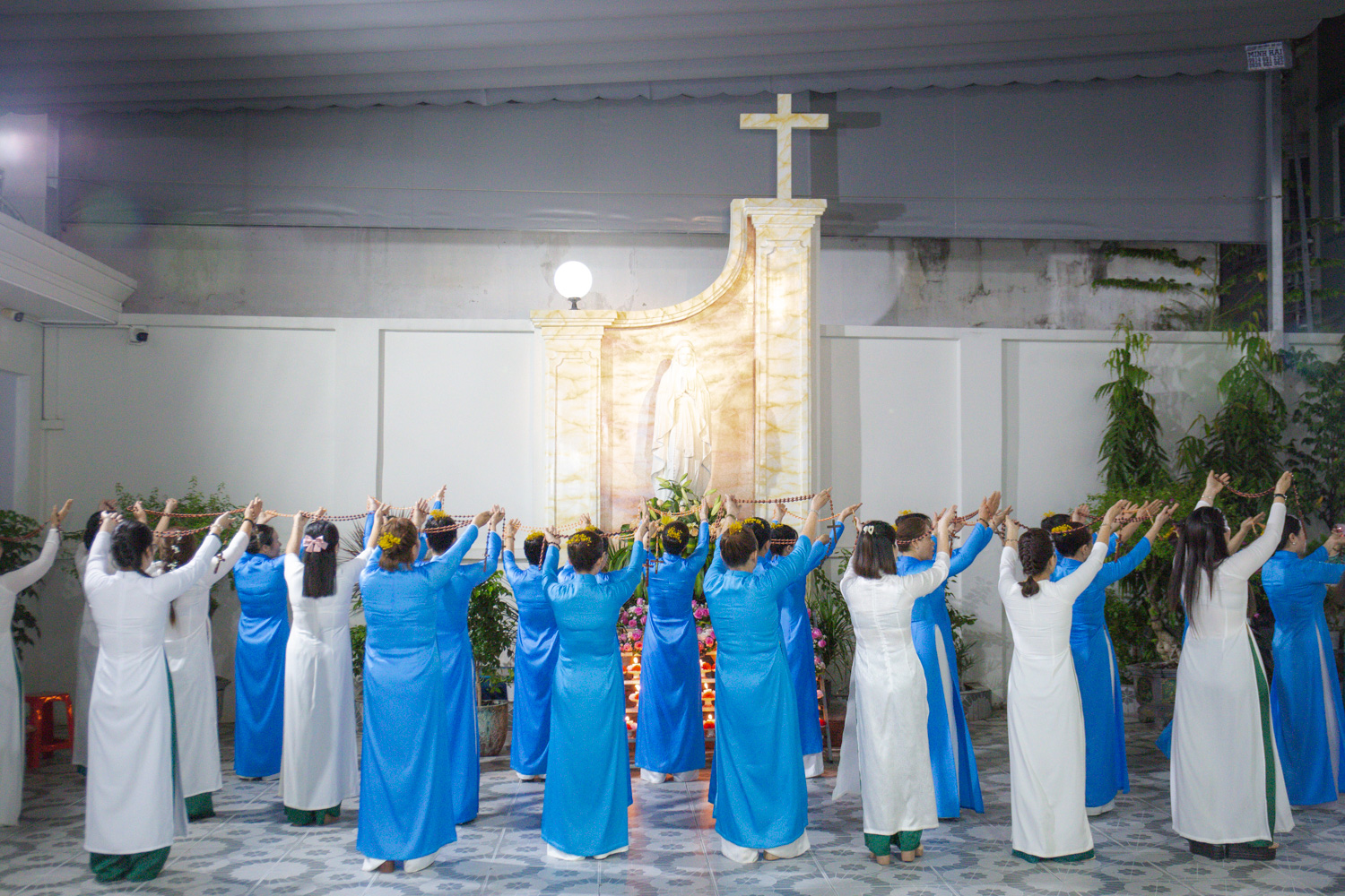 Đúng 18g00, cộng đoàn cùng nhau dâng hoa kính Đức Mẹ. Những đóa hoa tươi thắm rực rỡ sắc màu được dâng lên Mẹ như biểu tượng của lòng mến và lòng biết ơn sâu sắc. Trong tiếng hát ngọt ngào và ánh nến lung linh, những bước dâng hoa uyển chuyển đã làm bừng sáng không gian linh thánh. Mẹ như đang mỉm cười hiền từ, đón nhận từng cánh hoa – từng tâm hồn thật đơn sơ nhưng chan chứa tình con thảo.