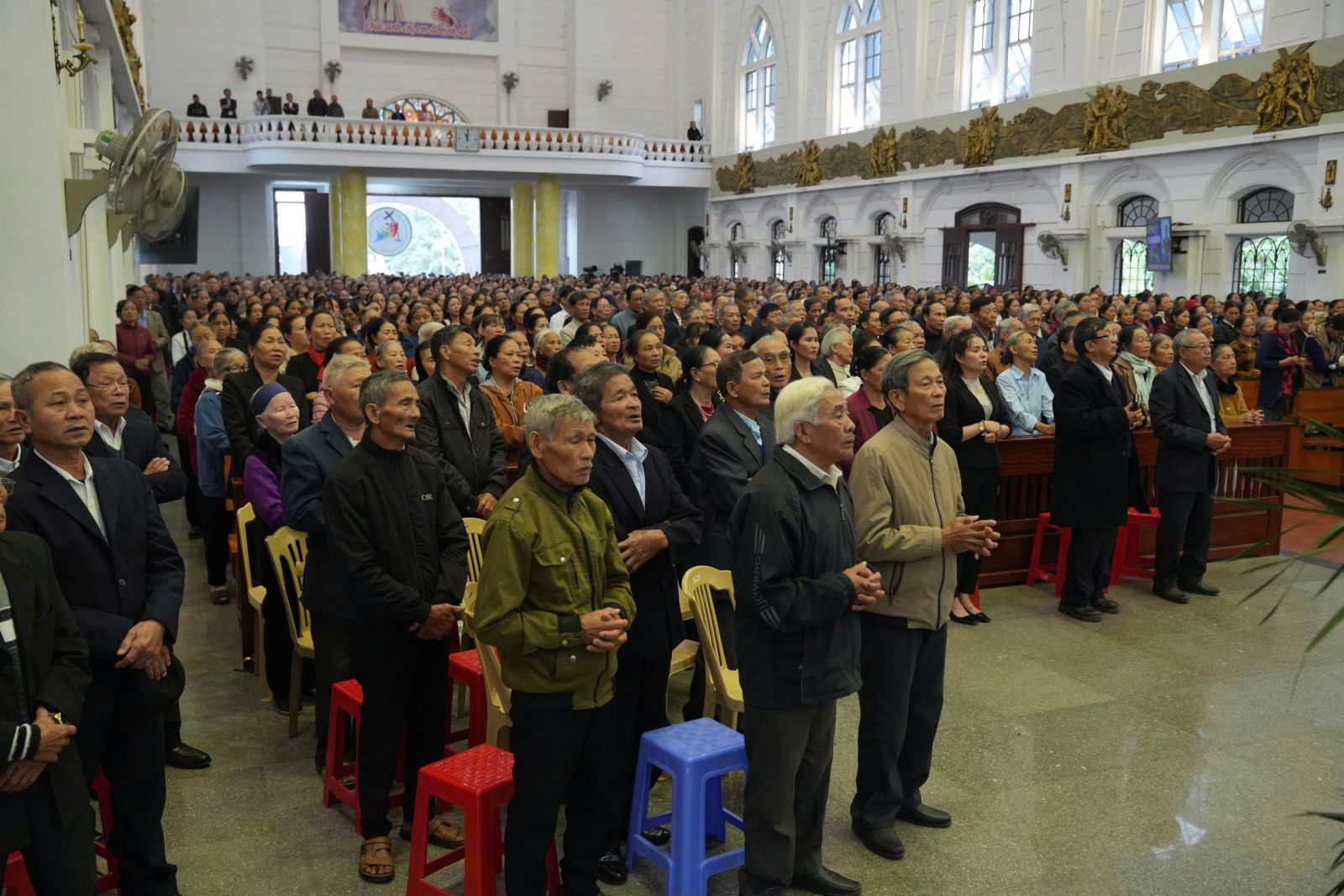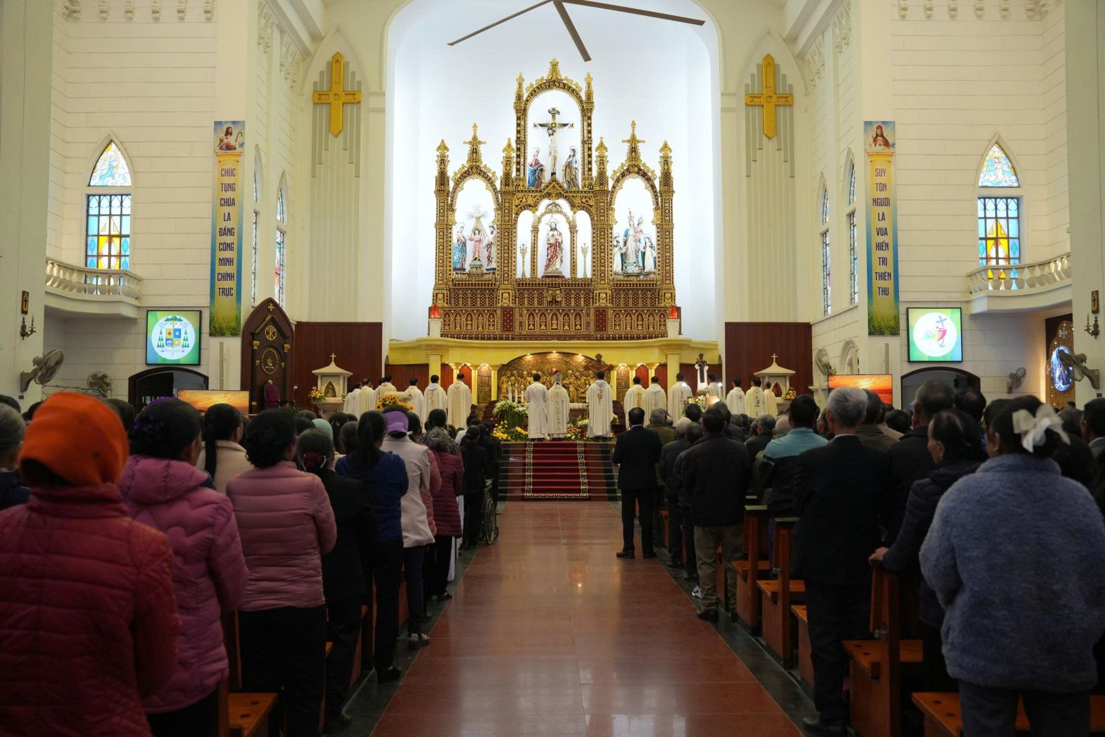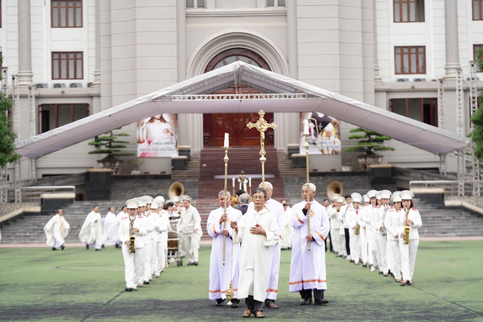 Đúng 09g00, đoàn đồng tế và kiệu thánh Quan thầy tiến bước từ quảng trường Tòa Giám mục vào nhà thờ hiệp dâng Thánh lễ tạ ơn.