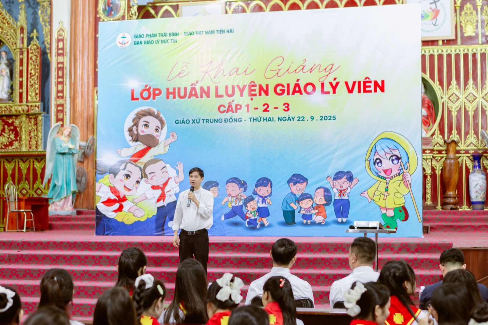 Tiếp nối chương trình, cha Quản hạt Đa-minh Bùi Thế Truyền đã khai giảng khoá học với một hồi trống dòn dã, và có những tâm tình với các học viên. Ngài bày tỏ niềm vui và sự khích lệ trước tinh thần học hỏi của các bạn trẻ. Cha nhấn mạnh rằng việc học giáo lý không chỉ là để có đủ kiến thức giảng dạy, mà còn là để củng cố đời sống đức tin cá nhân, giúp mỗi GLV trở thành một tấm gương sáng cho các em thiếu nhi noi theo. Những lời nhắn nhủ của cha đã chạm đến trái tim của mỗi tham dự viên, nhắc nhở mỗi người về sứ mệnh cao cả của mình.