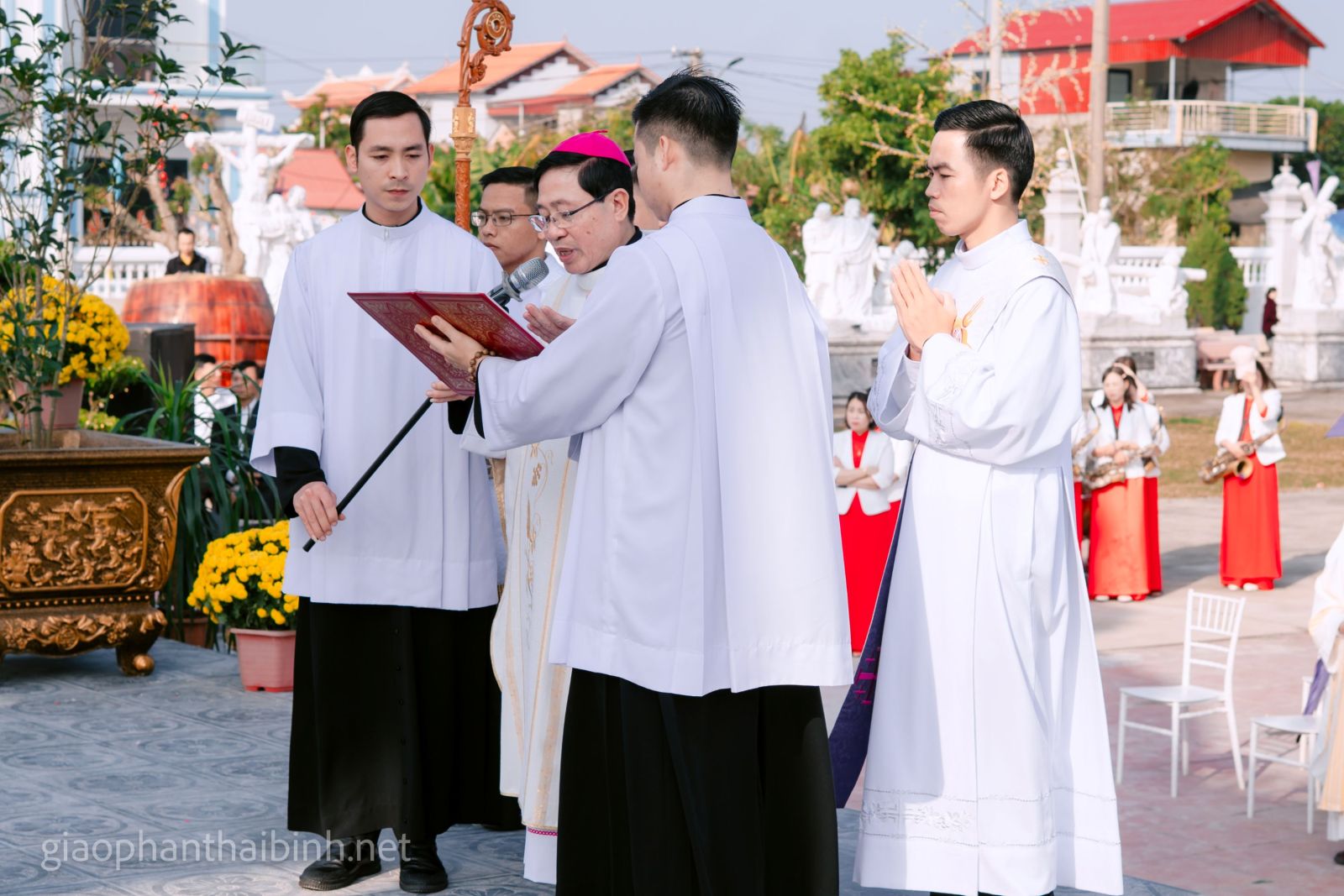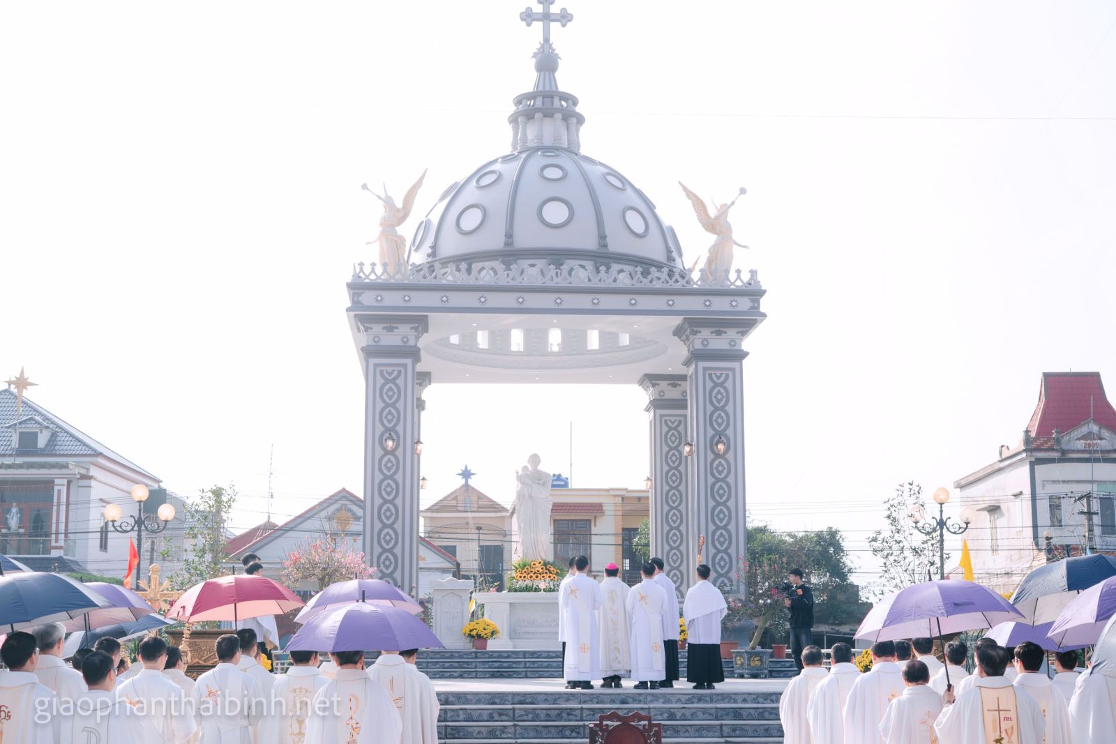 Trước khi cử hành Thánh lễ tạ ơn, cộng đoàn đã quy tụ trước đài Thánh Giuse để cử hành nghi thức cắt băng khánh thành linh đài, Đức cha Đa Minh làm phép Tượng các Thiên Thần trong sự trang nghiêm và sốt sắng.