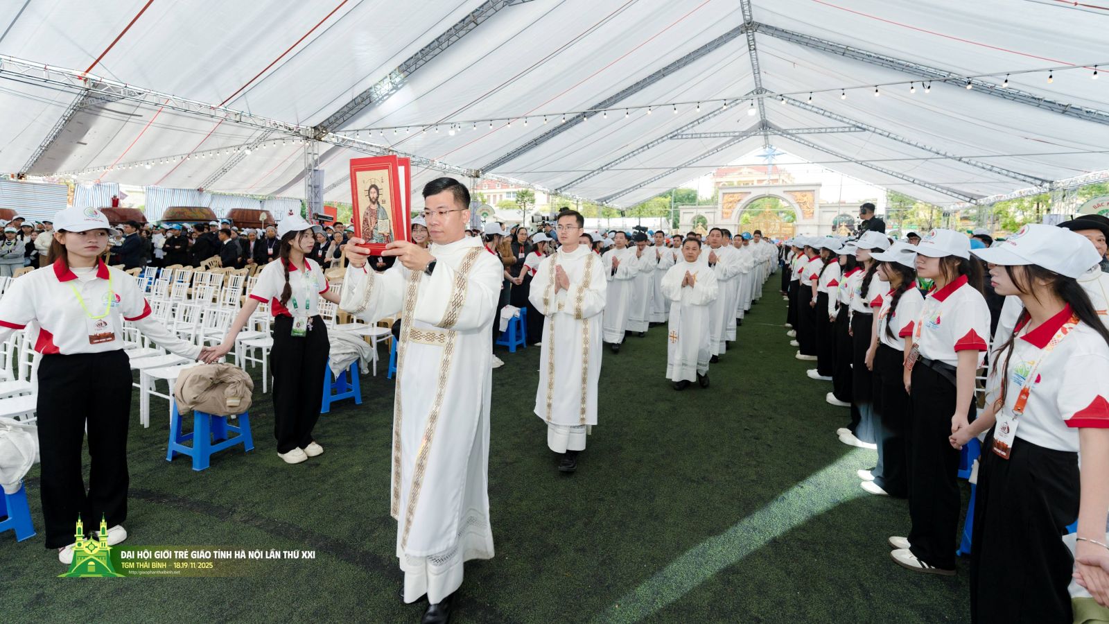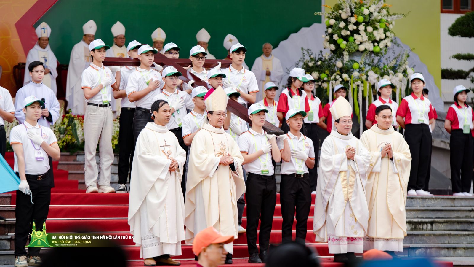 Ngay sau Thánh lễ là nghi thức trao Thánh Giá Đại hội cho Giáo phận Phát Diệm, nơi sẽ đăng cai Đại hội Giới trẻ Giáo tỉnh Hà Nội lần thứ XXII. Khoảnh khắc Thánh Giá được trao đã chạm đến trái tim của nhiều bạn trẻ: đó là sự tiếp nối không ngừng của hành trình đức tin và là lời mời gọi thế hệ mới tiếp tục mang lửa yêu mến Chúa đến với mọi người. Tiếng vỗ tay vang dội, những ánh mắt xúc động và niềm vui lan tỏa khắp quảng trường đã khép lại nghi thức cách trọn vẹn và thiêng liêng.