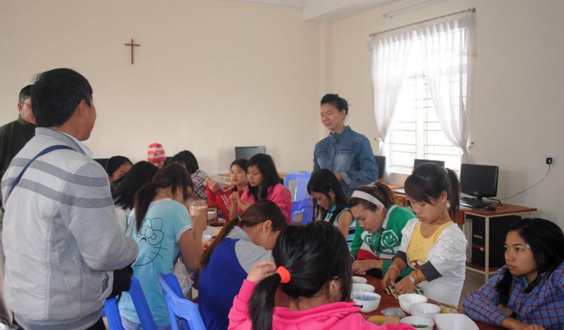 Sau khi thăm hỏi, chúng tôi được chị Thủy dẫn tới phòng làm việc của các em khuyết tật. Ngay từ xa, chúng tôi đã thấy rộn rã tiếng cười vui, như một nhóm người đang hội họp. Khi bước lại gần, mới biết đây là một nhóm anh chị em khuyết tật đang làm việc. Tận mắt chứng kiến cảnh làm việc của những người bị khuyết tật chúng tôi càng cảm thông cho công việc của các chị phụ trách ở nơi đây.