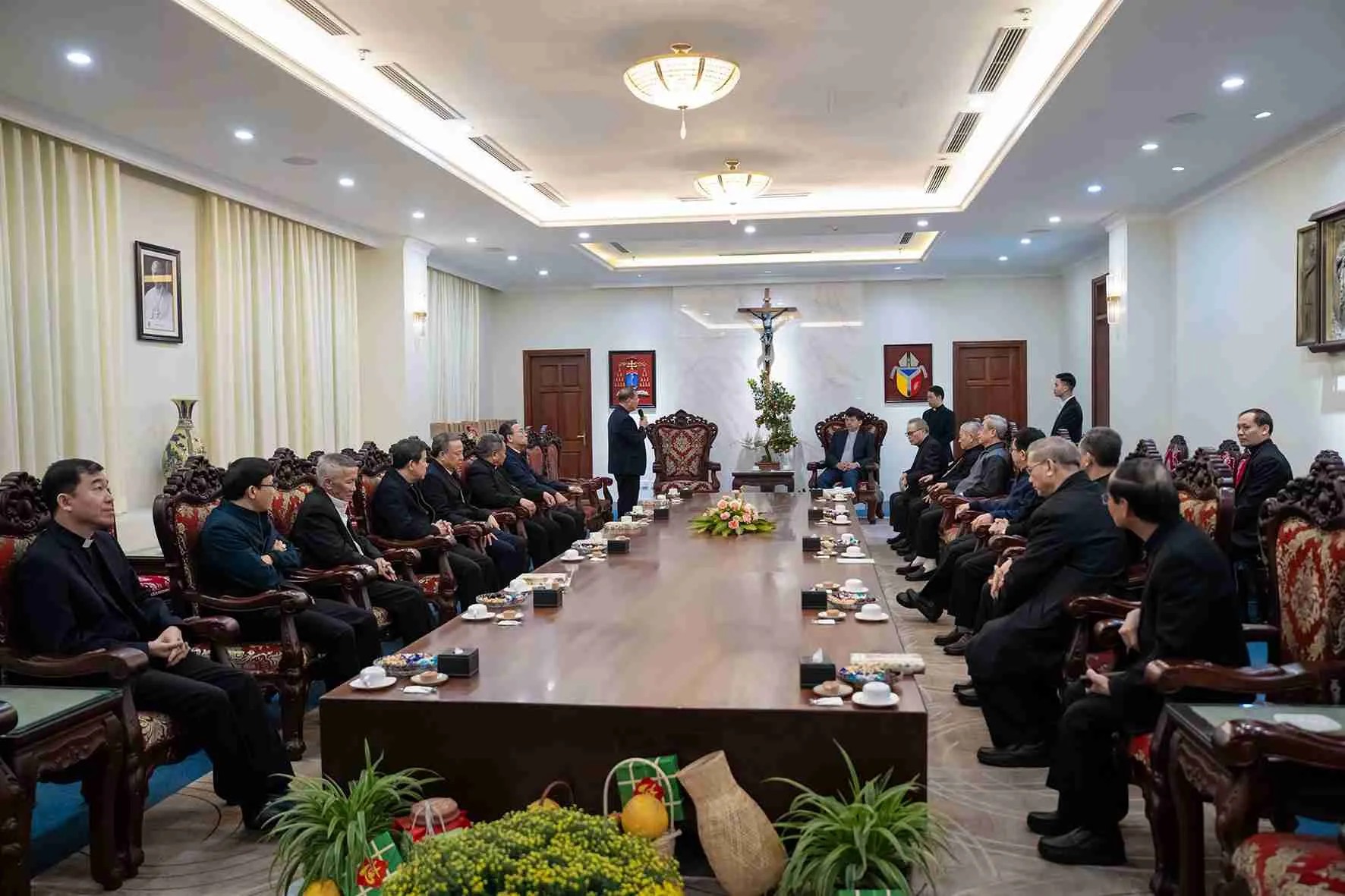 Vào lúc 11g15, Đức TGM Marek Zalewski – Đại diện Tòa Thánh thường trú tại Việt Nam đến gặp gỡ và chia sẻ với quý Đức cha. Sau đó, quý đấng bậc cùng dự bữa tiệc ấm áp tình huynh đệ.