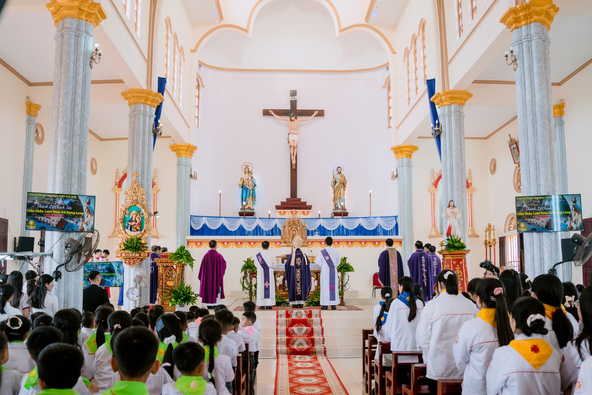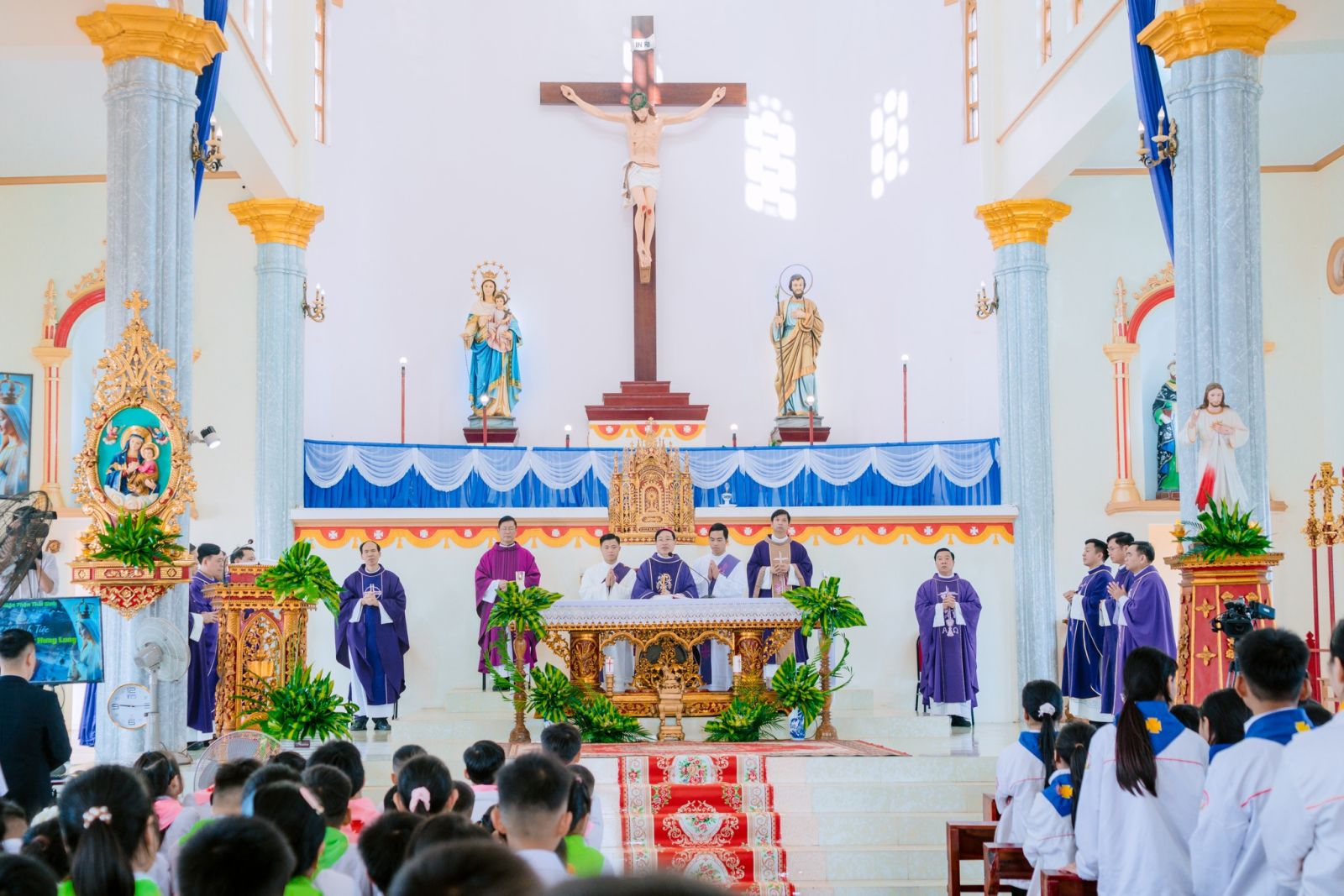 Sau cuộc rước long trọng đoàn đồng tế từ nhà Mục vụ tiến ra Thánh đường, Thánh lễ Chúa Nhật V Mùa Chay được cử hành với sự chủ tế của Đức cha Đa Minh.