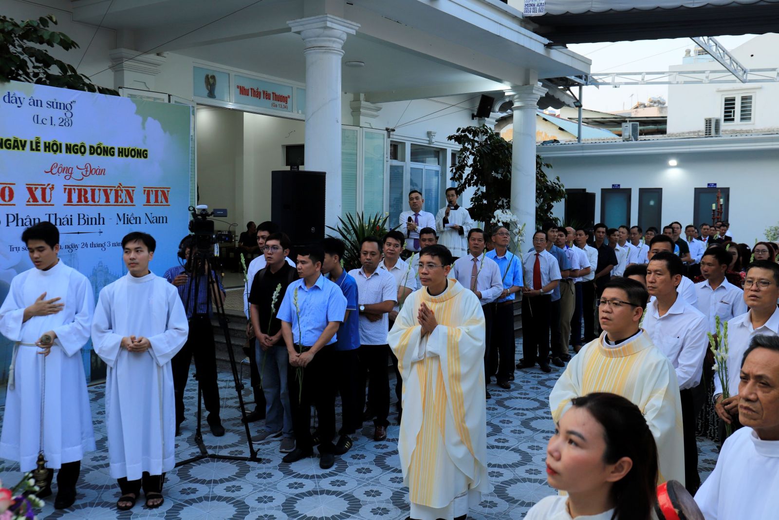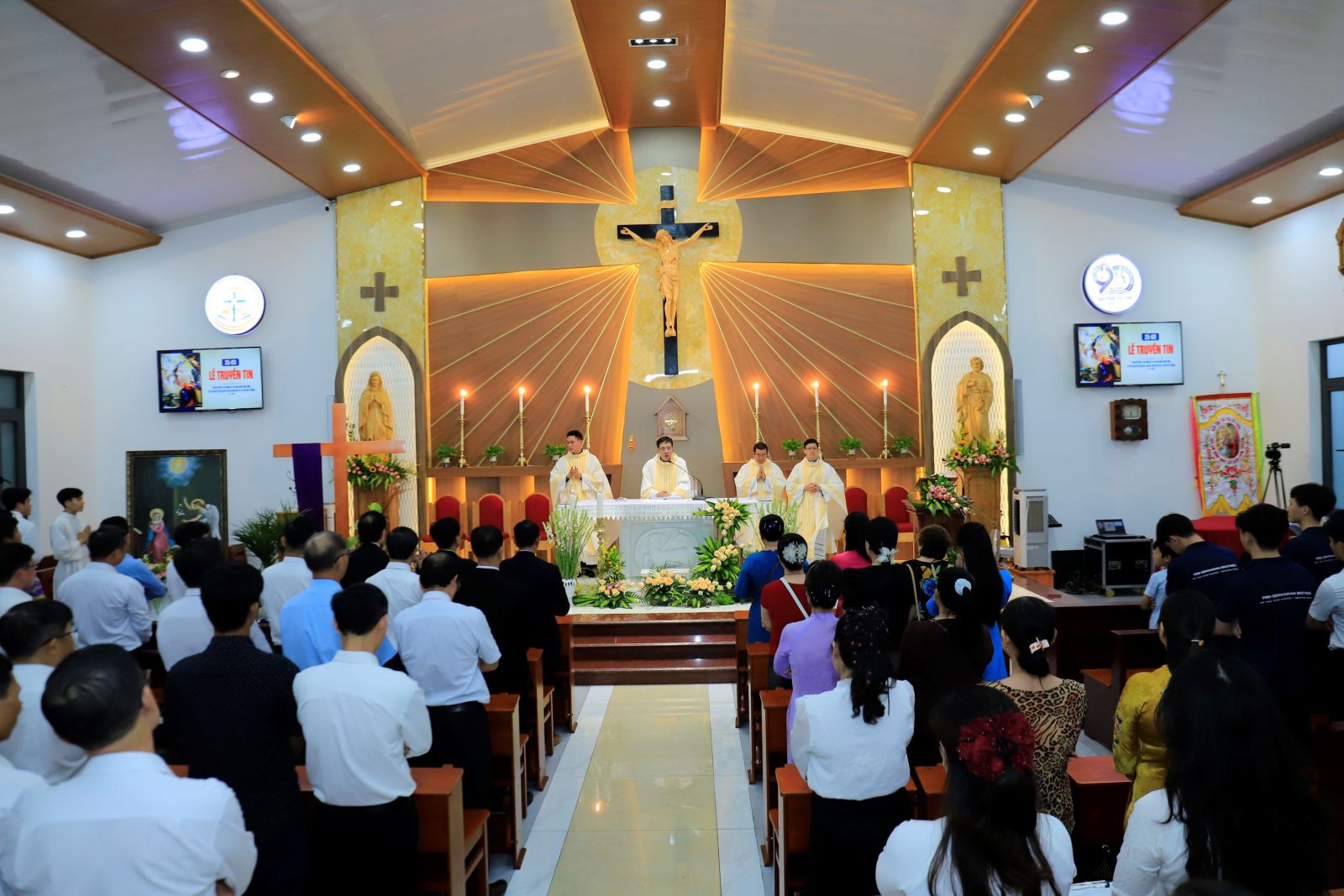 Sau cuộc rước, Thánh lễ mừng kính biến cố Truyền Tin được cử hành do cha phó Giám đốc Trụ sở Giuse Trần Ngọc Tuấn chủ tế. Cùng đồng tế với ngài có quý cha Trụ sở. Mở đầu Thánh lễ, cha Giuse gửi lời chào thân thương đến toàn thể cộng đoàn Đồng hương Giáo xứ Truyền Tin. Ngài bày tỏ niềm vui khi thấy đông đảo những người con xa quê quy tụ về bên nhau trong ngày mừng bổn mạng. Cha cũng nhấn mạnh rằng biến cố Truyền Tin là khởi đầu của mầu nhiệm cứu độ, đồng thời là lời mời gọi mỗi người Kitô hữu biết noi gương Đức Maria, luôn sẵn sàng thưa lời “Xin Vâng” trước thánh ý Chúa trong đời sống thường ngày. Ngài cầu chúc cho cộng đoàn luôn sống hiệp nhất, nâng đỡ nhau trong đức tin, để dù ở bất cứ nơi đâu vẫn luôn là dấu chỉ sống động của Tin Mừng.