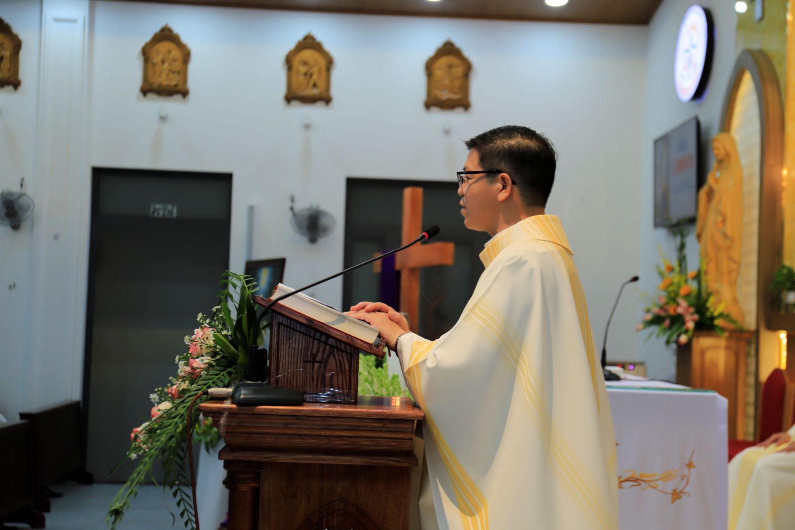 Trong phần chia sẻ Lời Chúa, cha Giám đốc Trụ sở Phero Verona Phạm Văn Nhật – Đặc trách Đồng hương Giáo phận Thái Bình tại miền Nam đã chia sẻ với cộng đoàn về chủ đề: “Thiên Chúa là Đấng di dân”. Cha nhấn mạnh rằng biến cố Truyền Tin không chỉ là một câu chuyện đơn sơ, nhưng là một sự kiện vĩ đại: Ngôi Lời Thiên Chúa nhập thể làm người. Thiên Chúa trở nên “Đấng di dân” đầu tiên khi rời bỏ vinh quang trời cao để bước vào lịch sử nhân loại, chia sẻ trọn vẹn thân phận con người để trở nên Emmanuel – Thiên Chúa ở cùng chúng ta. Thiên Chúa không áp đặt kế hoạch cứu độ nhưng chờ đợi sự cộng tác tự do của con người. Lời “Xin Vâng” của Đức Maria đã mở ra cánh cửa cứu độ mà bà Eva xưa đã đóng lại. Nhờ sự khiêm tốn và vâng phục, Đức Maria trở thành nhà tạm sống động cưu mang Con Thiên Chúa trong cung lòng.