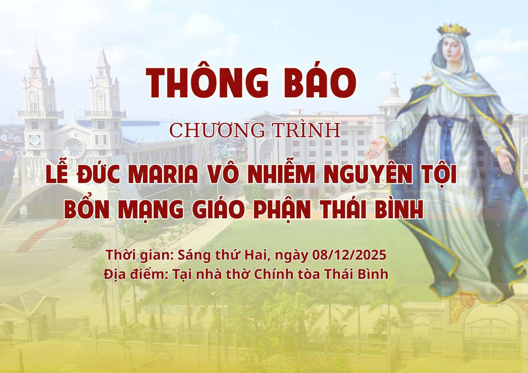 Ngày 08/12/2025, lễ kính Đức Maria Vô Nhiễm Nguyên Tội cũng là lễ Quan Thầy Giáo phận Thái Bình. Thừa lệnh Đức cha Đaminh chủ chăn Giáo phận, chúng con xin gửi tới quý cha, quý Bề Trên, quý Tu sĩ nam nữ các Dòng đang hiện diện phục vụ tại Giáo phận, quý thầy Chủng sinh, các hội hiền mẫu và cộng đoàn Dân Chúa THÔNG BÁO VỀ CHƯƠNG TRÌNH LỄ và kính mời quý Đấng bậc cùng cộng đoàn về hiệp dâng thánh lễ tạ ơn Chúa, cầu nguyện cho Giáo phận.